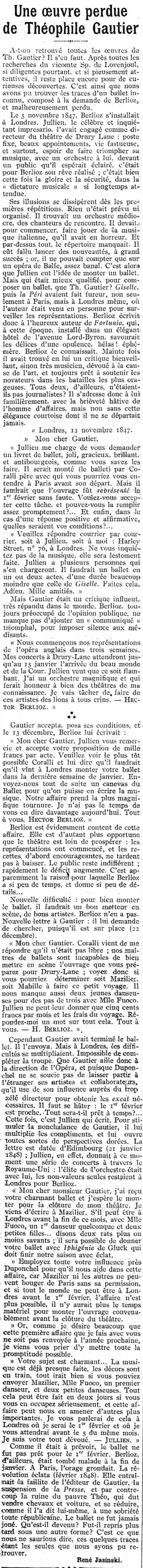 UNE ŒUVRE PERDUE DE THÉOPHILE GAUTIER A-t-on retrouvé toutes les œuvres de Th. Gautier? Il s'en faut. Après toutes les recherches du vicomte Sp. de Lovenjoul, si diligentes pourtant, et si pieusement attentives, il reste place encore pour de curieuses découvertes. C'est ainsi que nous avons pu trouver des traces d'un ballet inconnu, composé à la demande de Berlioz, et malheureusement perdu. Le 5 novembre 1847, Berlioz s'installait à Londres. Jullien, le célèbre et inquiétant impresario, l'avait engagé comme directeur du théâtre de Drury Lane: poste fixe, beaux appointements, vie fastueuse, et surtout, espoir de faire triompher sa musique, avec un orchestre à lui, devant un public qu'il espérait éclairé, c'était pour Berlioz son rêve réalisé ; c'était bien cette fois la gloire et la sécurité, dans la « dictature musicale », si longtemps attendue. Ses illusions se dissipèrent dès les premières répétitions. Rien n'était prévu ni organisé. Il trouvait un orchestre médiocre, des chanteurs de rencontre. Il devait, pour commencer, faire jouer de la musique italienne, qu'il avait en horreur. Et par-dessus tout, le répertoire manquait. Il eût fallu lancer des nouveautés, à grand succès; or, il ne pouvait compter que sur un opéra de Balfe, assez banal. C'est alors que Jullien eut l'idée de monter un ballet. Mais qui était mieux qualifié, pour composer un ballet, que Th. Gautier ? "Giselle", puis "la Péri" avaient fait fureur, non seulement à Paris, mais à Londres même, où l'auteur était venu en personne pour surveiller les représentations. Berlioz écrivit donc à l'heureux auteur de Fortunio, qui, à cette époque, installé dans un élégant hôtel de l'avenue Lord-Byron, savourait les délices d'une opulence, hélas! éphémère. Berlioz le connaissait. Mainte fois il avait trouvé en lui un critique bienveillant, sinon très musicien, dévoué à la cause de l'art, et toujours prêt à soutenir les novateurs dans les batailles les plus orageuses. Tous deux, d'ailleurs, n'étaient-ils pas journalistes? Il s'adresse donc à lui familièrement, avec la brièveté hâtive de l'homme d'affaires, mais non sans cette élégance courtoise dont il ne se départait jamais. « Londres, 12 novembre 1847. Mon cher Gautier, » Mais Gautier était un critique influent, très répandu dans le monde. Berlioz, toujours préoccupé de l'opinion publique, ne manque pas d'ajouter un « communiqué » triomphal, pour imposer silence aux médisants. Gautier accepta, posa ses conditions, et le 13 décembre, Berlioz lui écrivait: « Mon cher Gautier, Jullien vous remercie et accepte votre proposition de mille francs par acte. Veuillez voir le plus tôt possible Coralli et lui dire qu'il faudrait qu'il vint à Londres monter votre ballet dans la dernière semaine de janvier. Envoyez-nous tout de suite un canevas du Ballet pour qu'on puisse en écrire la musique. Notre affaire prend la plus magnifique tournure. Je n'ai pas le temps de vous en dire davantage aujourd'hui. Tout à vous, HECTOR BERLIOZ. » Berlioz est évidemment content de cette affaire. Elle est d'autant plus opportune que le théâtre est loin de prospérer, les représentations ont commencé, et les recettes, d'abord encourageantes, ne tardent pas à baisser. Le public reste indifférent; rapidement le déficit augmente. C'est apparemment la raison pour laquelle Berlioz a si peu de temps, et donne si peu de détails... Nouvelle difficulté pour bien monter le ballet, il faudrait un bon metteur en scène, de bons artistes. Berlioz n'en a pas. Nouvelle lettre à Gautier : il lui demande de chercher, puisqu'il est sur place (22 décembre). Cependant Gautier avait terminé le ballet. Il l'envoya. Mais à Londres, des difficultés se multipliaient. Impossible de compléter la troupe. Que Gautier aille donc à la direction de l'Opéra, et puisque Duponchel ne se soucie pas de laisser partir à l'étranger ses artistes et collaborateurs, qu'il use de son influence auprès du trop zélé directeur pour obtenir les exeat nécessaires. Il faut se hâter: le 1er février est proche. Tout sera-t-il prêt à temps?... Cette fois, c'est Jullien qui écrit. Pour stimuler la nonchalance de Gautier, il lui multiplie les compliments, et lui ouvre toutes sortes de perspectives dorées. La lettre est datée d'Edimbourg (21 janvier 1848); Jullien, en effet, donnait à ce moment une série de concerts à travers le Royaume-Uni: l'élite de l'orchestre. était avec lui, les non-valeurs seules restaient à Londres pour Berlioz. « Mon cher monsieur Gautier, j'ai reçu votre charmant ballet et j'espère le monter pour la clôture de mon théâtre. je viens d'écrire à Mazilier. S'il peut être à Londres avant la fin de ce mois, avec Mlle Fuoco, un danseur quelconque et deux petites filles... disons deux rats plus ou moins savants; il sera possible de donner votre ballet avec Iphigénie de Gluck qui doit finir notre saison avec éclat, » « Employez toute votre influence près Duponchel pour qu'il nous aide dans cette affaire, car Mazilier ni les autres ne peuvent bouger de Paris sans sa permission, et si tout le monde ne peut être à Londres avant le 1er février, l'affaire n'est plus possible, il n'y aurait plus le temps matériel pour monter l'ouvrage convenablement avant la clôture du théâtre. » « Or, comme je désire beaucoup que cette première affaire que je fais avec vous ne soit pas renvoyée à l'année prochaine, je viens vous prier d'y mettre toute la promptitude possible. » « Votre sujet est charmant... La musique est déjà presque faite, les décors sont en train, tout irait bien si vous pouviez envoyer Mazilier, Mlle Fuoco, un premier danseur, et deux petites danseuses. Tout cela peut être fait en deux jours si vous vous en occupez sérieusement, et cette affaire peut nous en amener d'autres plus importantes. Je vous parlerai de cela à Londres où je serai le 1er février et où je vous attendrai 