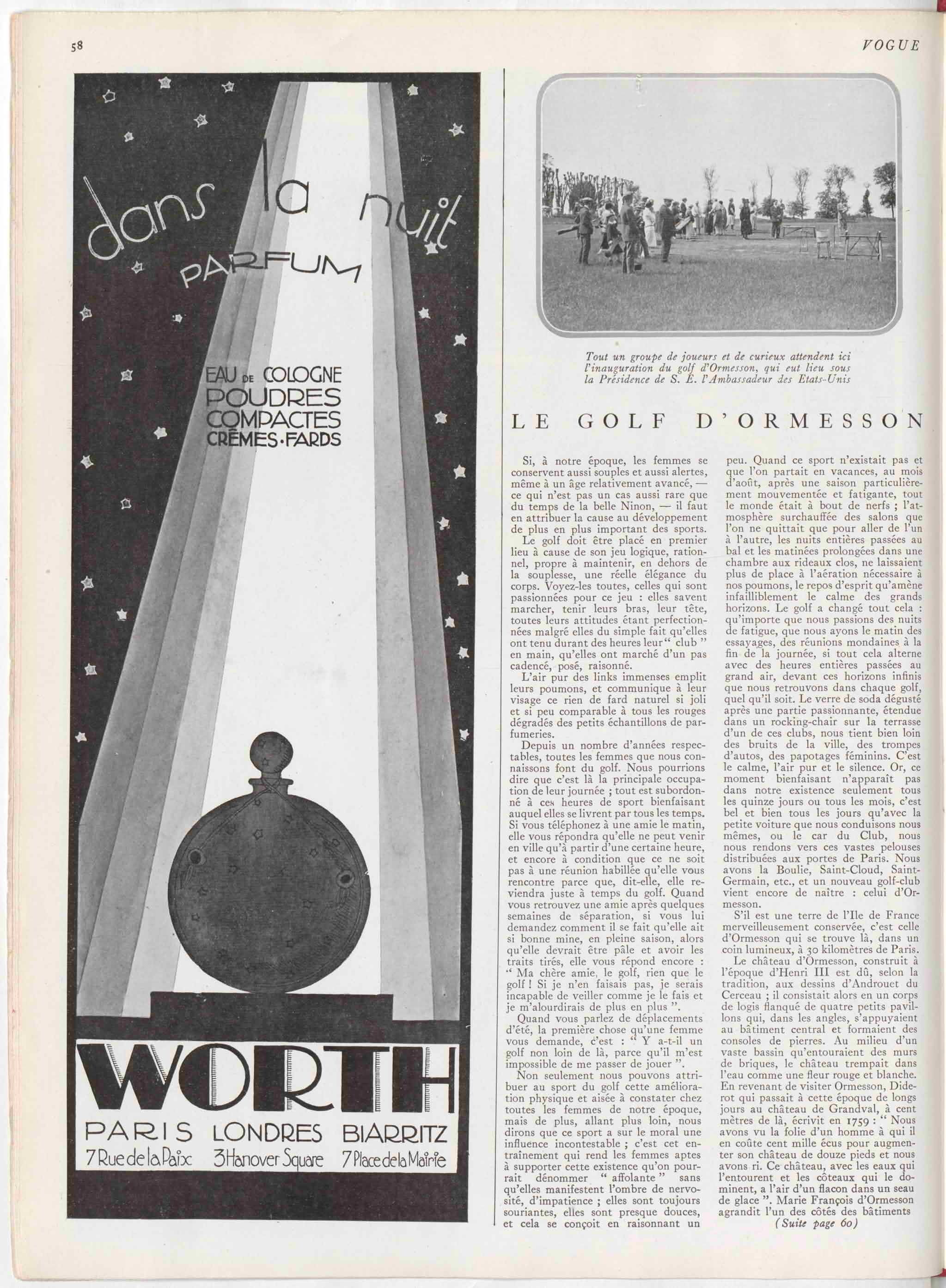 Si, à notre époque, les femmes se conservent aussi souples et aussi alertes, même à un âge relativement avancé, ce qui n'est pas un cas aussi rare que du temps de la belle Ninon, - il faut en attribuer la cause au développement de plus en plus important des sports. Le golf doit être placé en premier lieu à cause de son jeu logique, ration- nel, propre à maintenir, en dehors de la souplesse, une réelle élégance du corps. Voyez-les toutes, celles qui sont passionnées pour ce jeu : elles savent marcher, tenir leurs bras, leur tête, toutes leurs attitudes étant perfection- nées malgré elles du simple fait qu'elles ont tenu durant des heures leur" club " en main, qu'elles ont marché d'un pas cadencé, posé, raisonné. L'air pur des links immenses emplit leurs poumons, et communique à leur visage ce rien de fard naturel si joli et si peu comparable à tous les rouges dégradés des petits échantillons de par- fumeries. Depuis un nombre d'années respec- tables, toutes les femmes que nous con- naissons font du golf. Nous pourrions dire que c'est là la principale occupa- tion de leur journée ; tout est subordon- né à ces heures de sport bienfaisant auquel elles se livrent par tous les temps. Si vous téléphonez à une amie le matin, elle vous répondra qu'elle ne peut venir en ville qu'à partir d'une certaine heure, et encore à condition que ce ne soit pas à une réunion habillée qu'elle vous rencontre parce que, dit-elle, elle re- viendra juste à temps du golf. Quand vous retrouvez une amie après quelques semaines de séparation, si vous lui demandez comment il se fait qu'elle ait si bonne mine, en pleine saison, alors qu'elle devrait être pâle et avoir les traits tirés, elle vous répond encore: "Ma chère amie, le golf, rien que le golf! Si je n'en faisais pas, je serais incapable de veiller comme je le fais et je m'alourdirais de plus en plus ". Quand vous parlez de déplacements d'été, la première chose qu'une femme vous demande, c'est : " Y a-t-il un golf non loin de là, parce qu'il m'est impossible de me passer de jouer ". Non seulement nous pouvons attri- buer au sport du golf cette améliora- tion physique et aisée à constater chez toutes les femmes de notre époque, mais de plus, allant plus loin, nous dirons que ce sport a sur le moral une influence incontestable; c'est cet en- traînement qui rend les femmes aptes à supporter cette existence qu'on pour- rait dénommer "affolante " qu'elles manifestent l'ombre de nervo- sité, d'impatience; elles sont toujours souriantes, elles sont presque douces, et cela se conçoit en raisonnant un sans peu. Quand ce sport n'existait pas et que l'on partait en vacances, au mois d'août, après une saison particulière- ment mouvementée et fatigante, tout le monde était à bout de nerfs ; l'at- mosphère surchauffée des salons que l'on ne quittait que pour aller de l'un à l'autre, les nuits entières passées au bal et les matinées prolongées dans une chambre aux rideaux clos, ne laissaient plus de place à l'aération nécessaire à nos poumons, le repos d'esprit qu'amène infailliblement le calme des grands horizons. Le golf a changé tout cela : qu'importe que nous passions des nuits de fatigue, que nous ayons le matin des essayages, des réunions mondaines à la fin de la journée, si tout cela alterne avec des heures entières passées au grand air, devant ces horizons infinis que nous retrouvons dans chaque golf, quel qu'il soit. Le verre de soda dégusté après une partie passionnante, étendue dans un rocking-chair sur la terrasse d'un de ces clubs, nous tient bien loin des bruits de la ville, des trompes d'autos, des papotages féminins. C'est le calme, l'air pur et le silence. Or, ce moment bienfaisant n'apparaît pas dans notre existence seulement tous les quinze jours ou tous les mois, c'est bel et bien tous les jours qu'avec la petite voiture que nous conduisons nous mêmes, ou le car du Club, nous nous rendons vers ces vastes pelouses distribuées aux portes de Paris. Nous avons la Boulie, Saint-Cloud, Saint- Germain, etc., et un nouveau golf-club vient encore de naître : celui d'Or- messon. S'il est une terre de l'Ile de France merveilleusement conservée, c'est celle d'Ormesson qui se trouve là, dans un coin lumineux, à 30 kilomètres de Paris. Le château d'Ormesson, construit à l'époque d'Henri III est dû, selon la tradition, aux dessins d'Androuet du Cerceau; il consistait alors en un corps de logis flanqué de quatre petits pavil- lons qui, dans les angles, s'appuyaient au bâtiment central et formaient des consoles de pierres. Au milieu d'un vaste bassin qu'entouraient des murs de briques, le château trempait dans l'eau comme une fleur rouge et blanche. En revenant de visiter Ormesson, Dide- rot qui passait à cette époque de longs jours au château de Grandval, à cent mètres de là, écrivit en 1759: "Nous avons vu la folie d'un homme à qui il en coûte cent mille écus pour augmen- ter son château de douze pieds et nous avons ri. Ce château, avec les eaux qui l'entourent et les côteaux qui le do- minent, a l'air d'un flacon dans un seau de glace ". Marie François d'Ormesson agrandit l'un des côtés des bâtiments (Suite page 60)