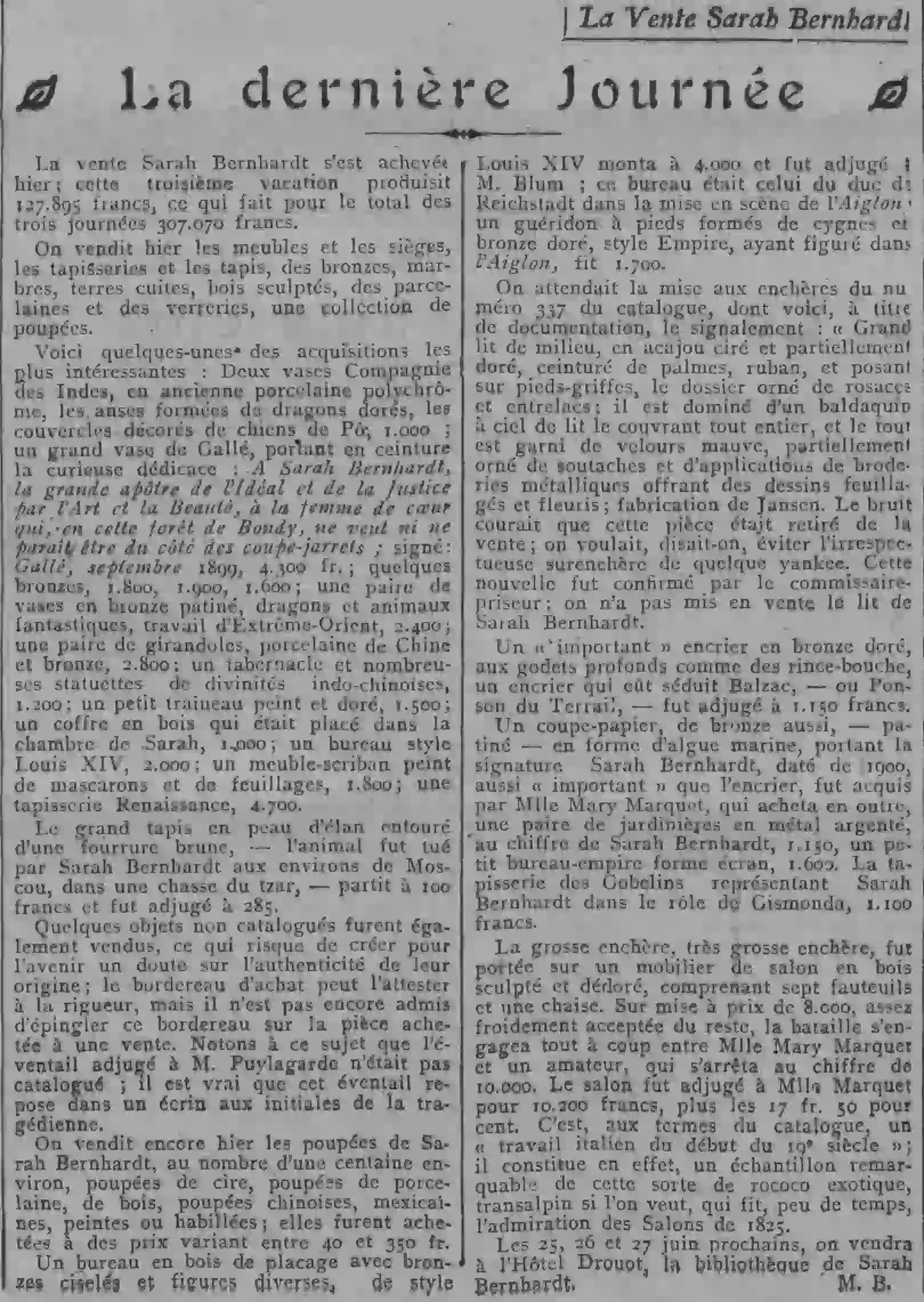 - la vente Sarah Bernhardt : le lit de la tragédienne a été retiré de la vente |