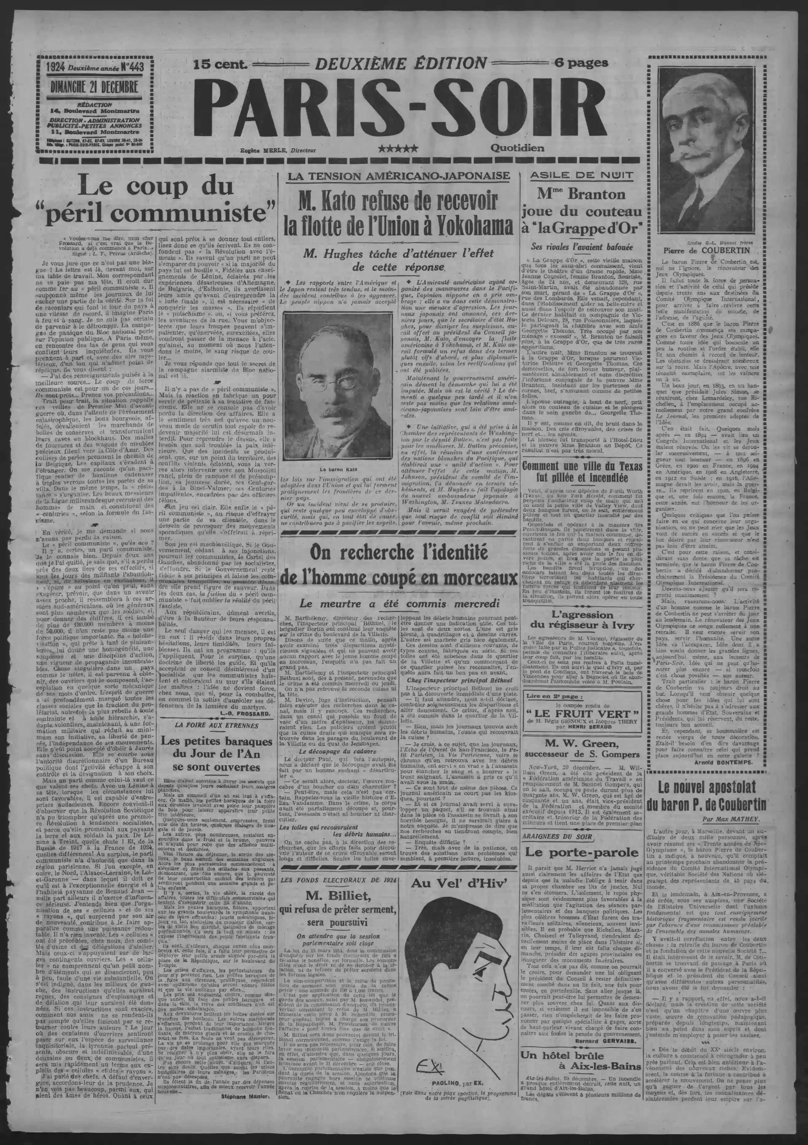 Page une et deux - Une interview de baron Pierre de Coubertin, personnage controversé dont certains écrits devraient être remis dans le contexte de la seconde moitié du 19ème siècle et la première moitié du 20ème. |