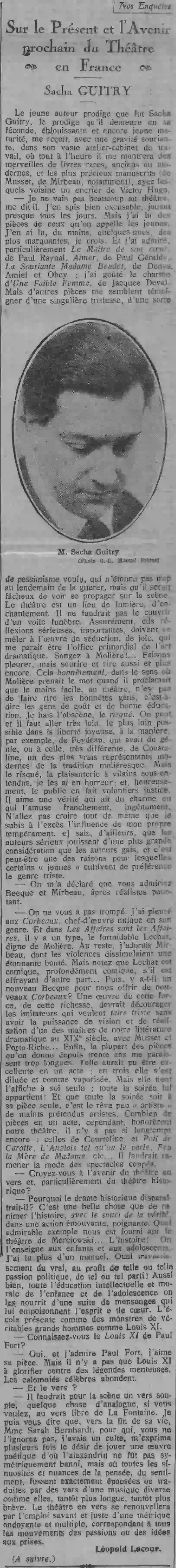Et Sacha Guitry en direct, celui d'il y a un siècle... Sur l'avenir du théâtre, une interview de Sacha Guitry qui n'est pas assidu des salles de spectacle Lucien Guitry joue "Pasteur" de Sacha Guitry. Une critique dithyrambique de la presse anglaise ou quand un père, après des années d'embrouilles avec son fils, joue de ce dernier une pièce sur un grand scientifique dont on a fêté à la fin de l'année dernière le bicentenaire de sa naissance Et à propos du père de Sacha Guitry, l'interprétation de Tartuffe de Lucien Guitry fait polémique Sacha Guitry à l'honneur, pour sa comédie musicale "l'amour masqué" réalisée avec la complicité du compositeur André Messager. |