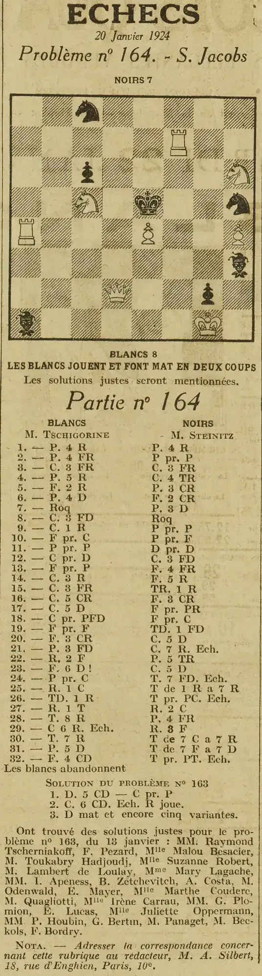 Les échecs, le problème numéro 165 et les solutions du 164