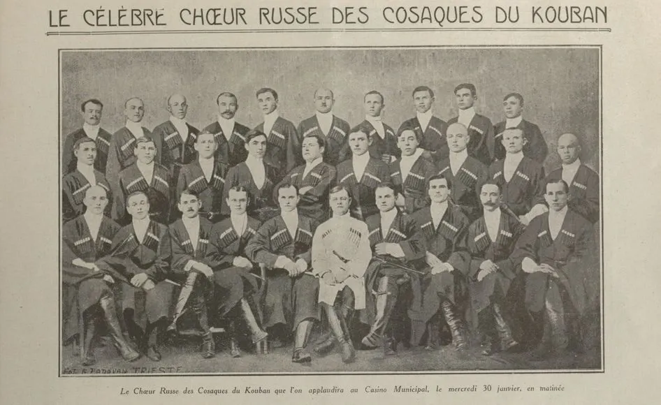 Le célèbre chœur russe cosaque de Kouban qui se produira au Casino municipal de Nice, en photo le groupe complet ... sauf changement de programme, un certain Lénine vient de passer l'arme à gauche ( d'accord un peu facile, alors la Bignole dirait plutôt "Lénine ist über die Wupper gesprungen", rejoindera-t-il Friedrich Engels ?)