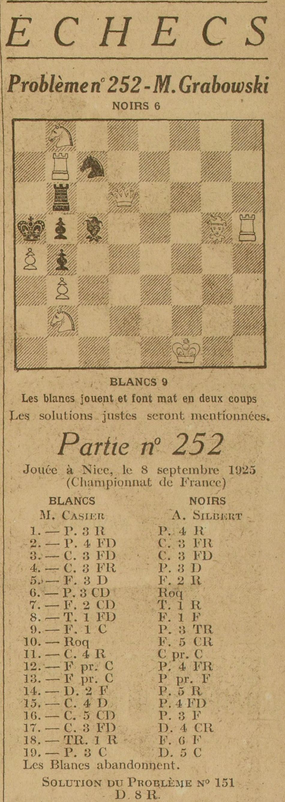 Page une - La partie d'échecs numéro 252 jouée le 09 septembre 1925 lors du championnat de France à Nice, entre Robert Casier et Adolphe Silbert et le problème de