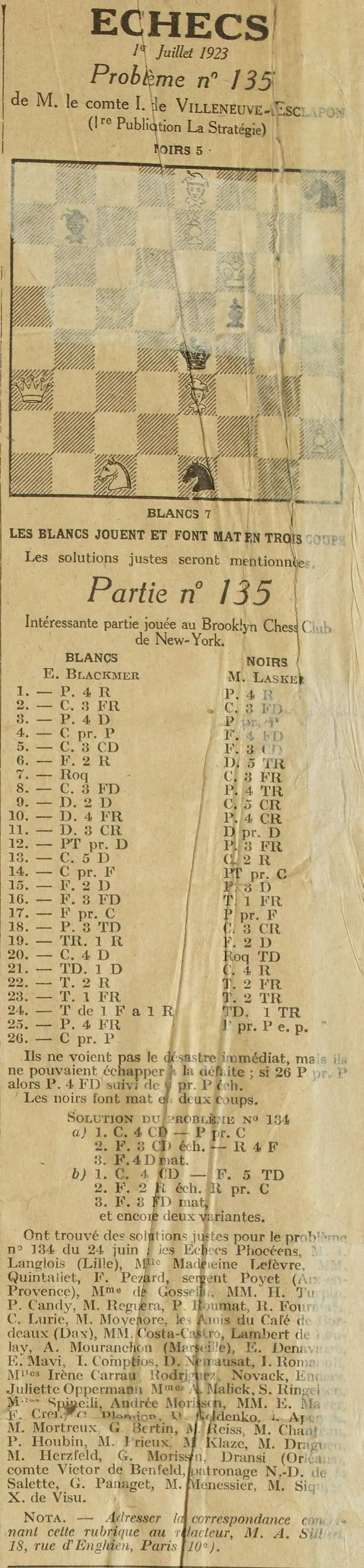 Page quatre - récréation avec le problème d'échecs n° 135, la solution du problème n°134 et la partie jouée entre Lasker et Blackmer |