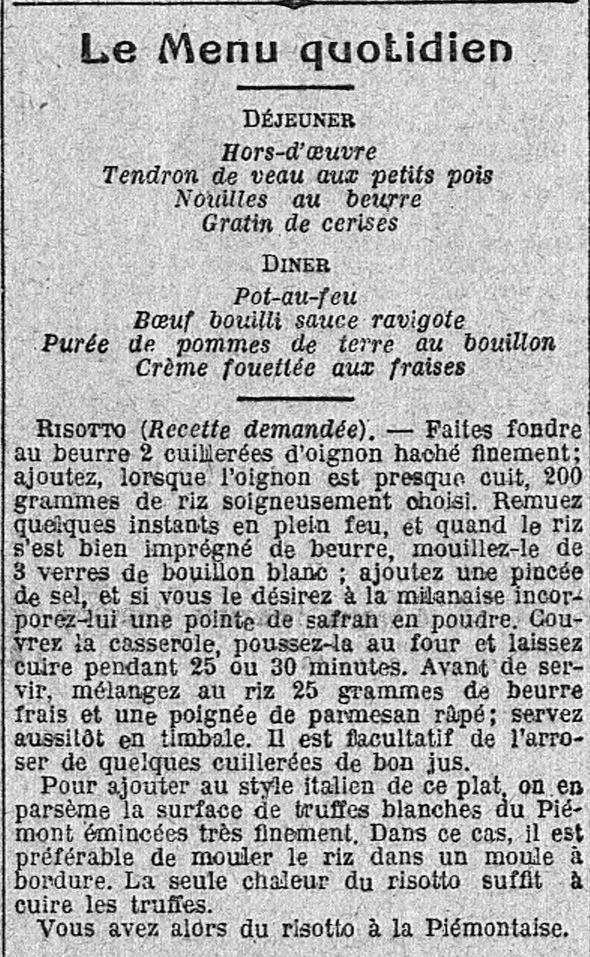 - le menu quotidien avec la recette du risotto, risotto à la milanaise et risotto à la piémontaise |
