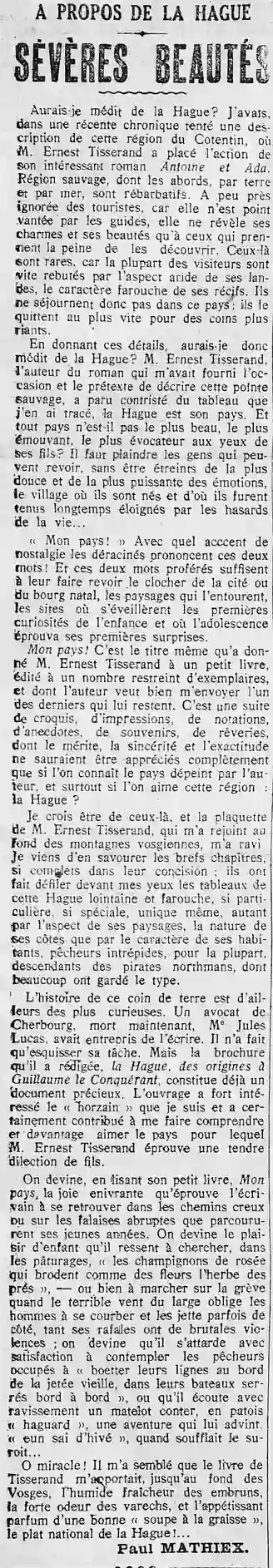 Would I have slandered the Hague? I had, in a recent column, attempted a description of this region of the Cotentin, where Mr. Ernest Tisserand placed the action of his interesting novel Antoine and Ada. Wild region, whose approaches, by land and by sea, are forbidding. Virtually ignored by tourists, because it is not praised by guides, it only reveals its charms and beauties to those who take the trouble to discover them. These are rare, because most visitors are quickly put off by the arid aspect of its moors, the wild character of its reefs. They therefore do not stay in this country. they leave it as quickly as possible for more cheerful corners. In giving these details, would I have slandered La Hague? Mr. Ernest Tisserand, the author of the novel which had provided me with the opportunity and the pretext to describe this wild point, seemed saddened by the picture I drew of it, the Hague is his country. And isn't every country the most beautiful, the most moving, the most evocative in the eyes of its sons? We must pity the people who can see again, without being embraced by the sweetest and most powerful of emotions, the village where they were born and from which they were kept away for a long time by the hazards of life... " My country! With what an accent of nostalgia the uprooted pronounce these two words! And these two words uttered are enough to make them see again the steeple of the city or the native town, the landscapes which surround it, the sites where the first curiosities of childhood awoke and where adolescence experienced its first surprises. My country! This is the very title that M. Ernest Tisserand gave to a little book, published in a limited number of copies, and of which the author is willing to send me one of the last that remains to him. It is a series of sketches, impressions, notations, anecdotes, memories, daydreams, the merit, sincerity and accuracy of which cannot be fully appreciated unless one knows the country depicted by the author, and especially if you like this region. the Hague? I believe I am one of those, and the brochure of Mr. Ernest Tisserand, who joined me at the bottom of the Vosges mountains, delighted me. I have just savored the brief chapters, so complete in their conciseness: they have paraded before my eyes the paintings of this distant and fierce Hague, so particular, so special, unique even, as much by the aspect of its landscapes, the nature of its coasts than by the character of its inhabitants, intrepid fishermen, for the most part, descendants of Northman pirates, many of whom have retained the type. The history of this corner of the earth is also one of the most curious. A lawyer from Cherbourg, now dead, Madame Jules Lucas, had undertaken to write it. He only outlined his task. But the brochure he wrote, The Hague, from its origins to William the Conqueror, is already a valuable document. The book was of great interest to the "horzain" that I am and certainly contributed to making me understand and love the country for which Mr. Ernest Tisserand feels a tender love of son. We guess, by saying his little book, My country, the intoxicating joy that the writer feels to find himself in the hollow roads or on the steep cliffs that his young years traversed. We can imagine the childlike pleasure he feels in looking in the pastures for "the dew mushrooms which embroider the grass of the meadows like flowers"—or even in walking on the shore when the terrible wind from the sea obliges the men to bend down and sometimes throws them aside, so violent are its gusts; we can guess that he lingers with satisfaction to contemplate the fishermen busy "baiting their lines at the edge of the old pier, in their boats tightly packed side by side", or that he listens with delight to a sailor recounting, in patois " haguard”, an adventure which happened to him, “eun sai d'hiver”, when the suroît was blowing. O miracle! It seemed to me that Tisserand's book carried me to the depths of the Vosges, the damp freshness of the sea spray, the strong smell of kelp, and the appetizing scent of a good "fat soup", the dish National of the Hague! Paul Mathiex. |