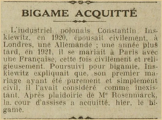 BIGAMA ACQUITED The Polish industrialist Constantin Inskiewitz, in 1920, married civilly, in London, a German. A year later, in 1921, he married a Frenchwoman in Paris, this time civilly and religiously. Prosecuted for bigamy, Inskiewitz explained that, his first marriage having been purely and simply civil, he had considered it as non-existent. After pleading by M° Rosenmarck, the Assize Court yesterday acquitted the bigamist |
