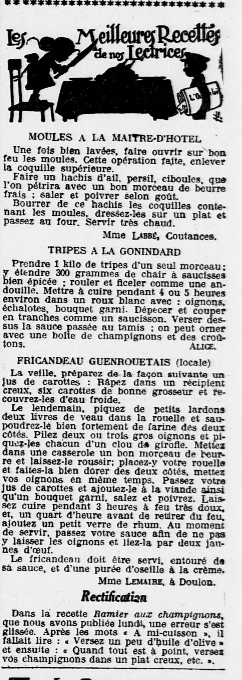 Et page deux - Les meilleures recettes de nos lectrices : moules à la maître d'hôtel, tripes à la Gonindard et fricandeau guenrouetais (locale) |