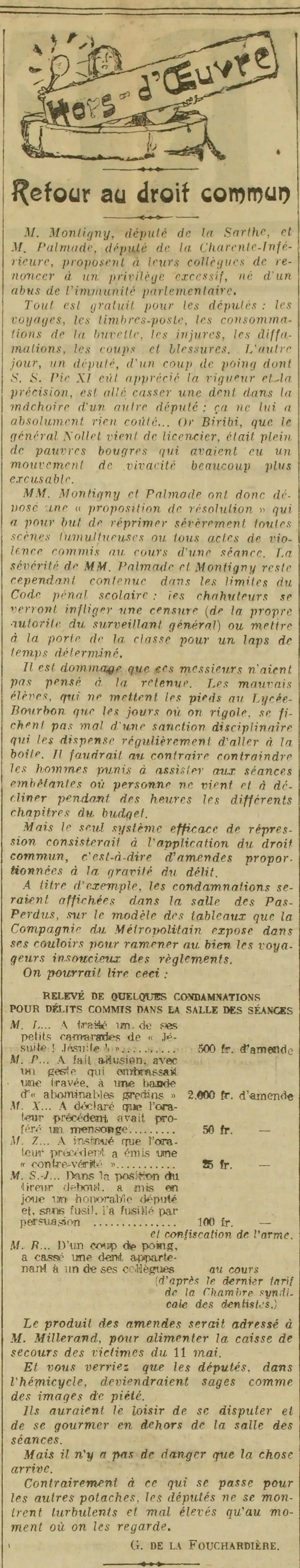 M. Montigny, député de la Sarthe, et M. Palmade, député de la Charente-Inférieure, proposent à leurs collègues de renoncer à un privilège excessif, né d'un abus de l'immunité parlementaire. Tout est gratuit pour les députés : les voyages, les timbres-poste, les consommations de la buvette, les injures, les diffamations, les coups et blessures. L'autre jour, un député, d'un coup de poing dont S. S. Pie XI eût apprécié la vigueur et la précision, est allé casser une dent dans la mâchoire d'un autre député; ça ne lui a absolument rien coûté... Or Biribi, que le général Nollet vient de licencier, était plein de pauvres bougres qui avaient eu un mouvement de vivacité de vivacité beaucoup plus excusable. MM. Montigny et Palmade ont donc déposé une « proposition de résolution » qui a pour but de réprimer sévèrement toutes scènes tumultueuses ou tous actes de violence commis au cours d'une séance. La sévérité de MM. Palmade et Montigny reste cependant contenue dans les limites du Code pénal scolaire: les chahuteurs se verront infliger une censure (de la propre autorité du surveillant général) ou mettre à la porte de la classe pour un laps de temps déterminé. Il est dommage que ces messieurs n'aient pas pensé à la retenue. Les mauvais élèves, qui ne mettent les pieds au Lycée-Bourbon que les jours où on rigole, se fichent pas mal d'une sanction disciplinaire qui les dispense régulièrement d'aller à la boite. Il faudrait au contraire contraindre les hommes punis à assister aux séances embêtantes où personne ne vient et à décliner pendant des heures les différents chapitres du budget. Mais le seul système efficace de répression consisterait à l'application du droit commun, c'est-à-dire d'amendes proportionnées à la gravité du délit. A titre d'exemple, les condamnations seraient affichées dans la salle des Pas- Perdus, sur le modèle des tableaux que la Compagnie du Métropolitain expose dans ses couloirs pour ramener au bien les voyageurs insoucieux des règlements. On pourrait lire ceci :