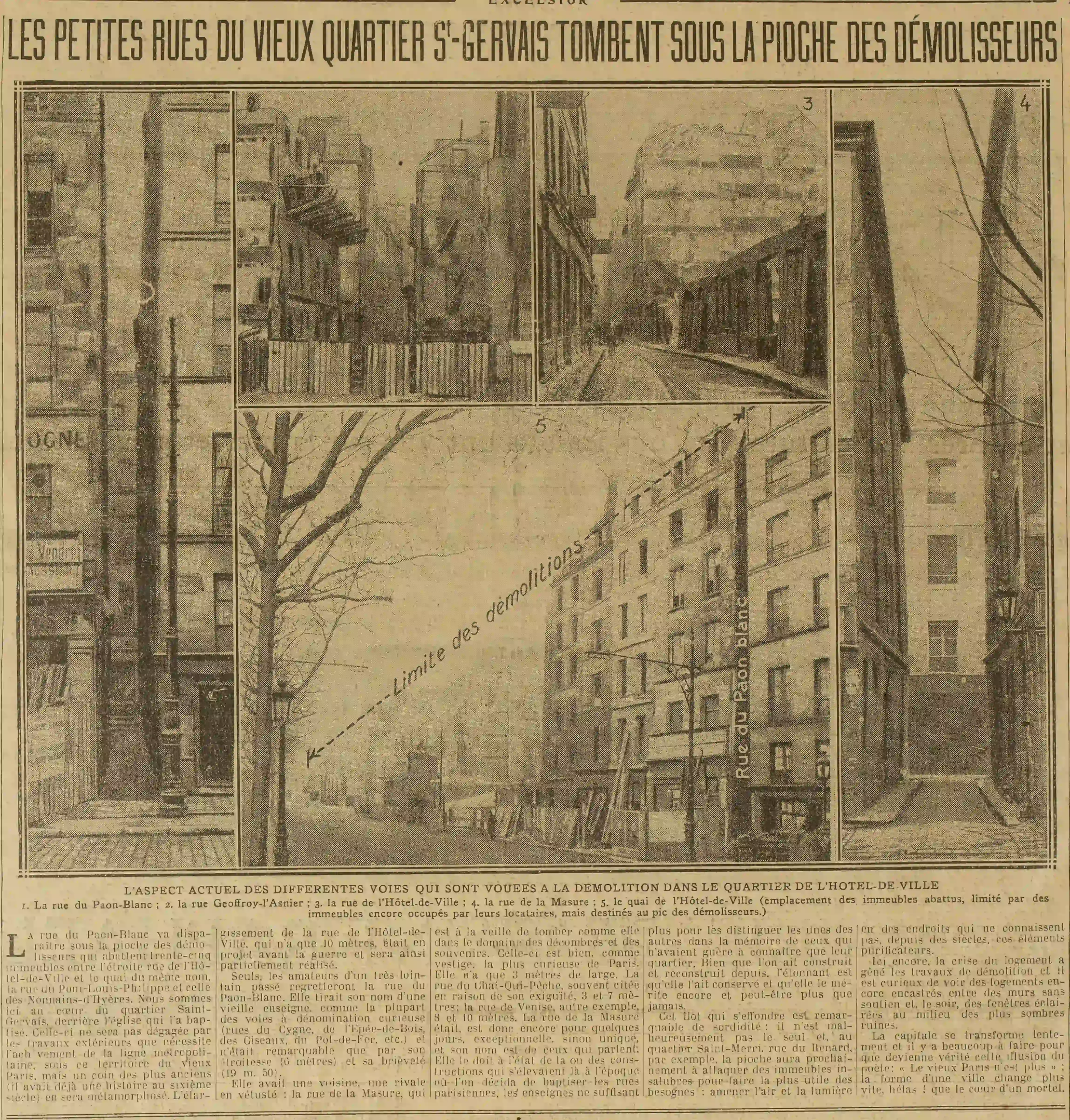 L'aspect actuel des différentes voies qui sont vouées a la démolition dans le quartier de l'Hôtel-de-Ville 1. La rue du Paon-Blanc; 2. la rue Geoffroy-l'Asnier; 3. la rue de l'Hôtel-de-Ville; 4. la rue de la Masure; 5. le quai de l'Hôtel-de-Ville (emplacement des immeubles abattus, limité par des immeubles encore occupés par leurs locataires, mais destinés au pic des démolisseurs.) La rue du Paon-Blanc va disparaître sous la pioche des démolisseurs qui abattent trente-cinq Immeubles entre l'étroite rue de l'Hôtel-de-Ville et le quai du même nom, la rue du Pont-Louis-Philippe et celle des Nonnains-d'Hyères. Nous sommes ici au cœur du quartier Saint-Gervais, derrière l’église qui l'a baptisé. Celle-ci ne sera pas dégagée par les travaux extérieurs que nécessite l'achèvement de la ligne métropolitaine, sous ce territoire du vieux Paris, mais un coin des plus anciens (il avait déjà une histoire au sixième siècle) en sera métamorphosé. L'élargissement de la rue de l'Hôtel-de- Ville, qui n'a que 10 mètres, était en projet avant la guerre et sera ainsi partiellement réalisé. Seuls, les amateurs d'un très lointain passé regretteront la rue du Paon-Blanc. Elle tirait son nom d'une vieille enseigne, comme la plupart des voies à dénomination curieuse (rues du Cygne, de l'Epée-de-Bois, des Ciseaux, du Pot-de-Fer, etc.) et n'était remarquable que par son étroitesse (6 mètres) et sa brièveté: (19 m. 50). Elle avait une voisine, une rivale. en vétusté la rue de la Masure,qui est à la veille de tomber comme elle dans le domaine des décombres et des souvenirs. Celle-ci est bien, comme vestige, la plus curieuse de Paris. Elle n'a que 3 mètres de large. La rue du Chat-Qui-Pêche, souvent citée en raison de son exiguïté, 3 et 7 mètres; la rue de Venise, autre exemple, 8 et 10 mètres. La rue de la Masure était, est donc encore pour quelques jours, exceptionnelle, sinon unique, et son nom est de ceux qui parlent. Elle le doit à l'état de la ou des constructions qui s'élevaient là à l'époque où l’on décida de baptiser les rues parisiennes, les enseignes ne suffisant plus pour les distinguer les unes des autres dans la mémoire de ceux qui n'avaient guère à connaître que leur quartier. Bien que l'on ait construit et reconstruit depuis, l'étonnant est qu'elle l'ait conservé et qu'elle le mérite encore et peut-être plus que jamais. Cet ilot qui s'effondre est remarquable de sordidité: il n'est malheureusement pas le seul et, au quartier Saint-Merri, rue du Renard, par exemple, la pioche aura prochainement à attaquer des immeubles insalubres pour faire la plus utile des besognes: amener l'air et la lumière,en des endroits qui ne connaissent pas, depuis des siècles, ces éléments purificateurs. Ici encore, la crise du logement a gêné les travaux de démolition et il est curieux de voir des logements encore encastrés entre des murs sans soutien et, le soir, des fenêtres éclairées au milieu des plus sombres ruines. La capitale se transforme lentement et il y a beaucoup à faire pour que devienne vérité cette illusion du poète : ∗« Le vieux Paris n'est plus ; la forme d'une ville change plus vite, hélas ! que le cœur d'un mortel. »