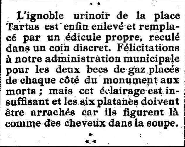 L'ignoble urinoir de la place Tartas est enfin enlevé et remplacé par un édicule propre, reculé dans un coin discret. Félicitations à notre administration municipale pour les deux becs de gaz placés de chaque côté du monument aux morts; mais cet éclairage est insuffisant et les six platanes doivent être arrachés car ils figurent là comme des cheveux dans la soupe.