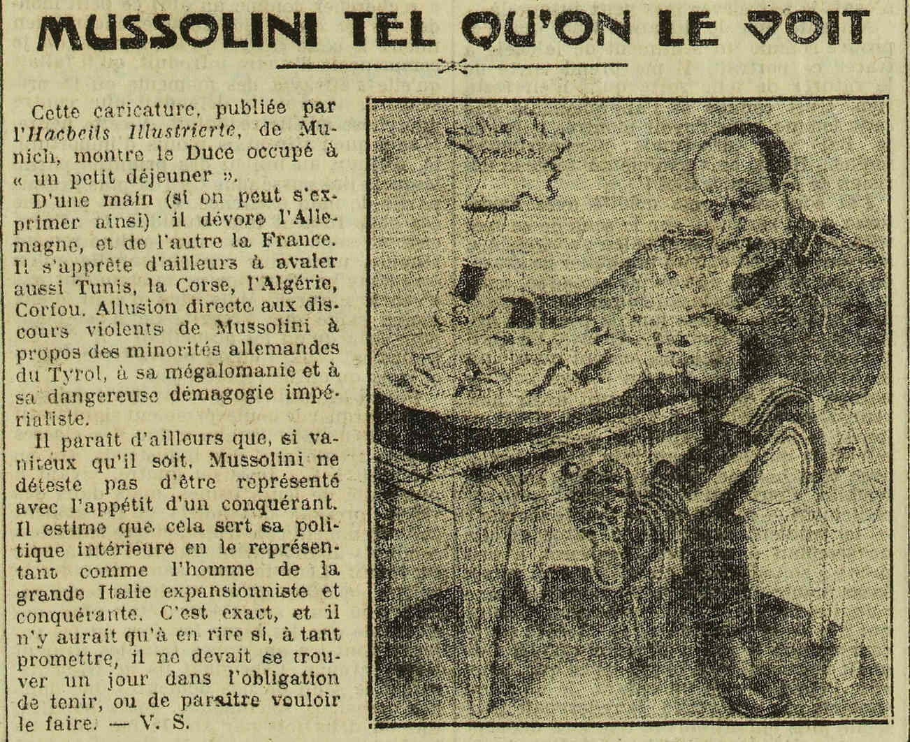 D'une main (si on peut s'exprimer ainsi) il dévore l'Allemagne, et de l'autre la France. Il s'apprête d'ailleurs à avaler aussi Tunis, la Corse, l'Algérie, Corfou. Allusion directe aux discours violents de Mussolini à propos des minorités allemandes du Tyrol, à sa mégalomanie et à sa dangereuse démagogie impérialiste.