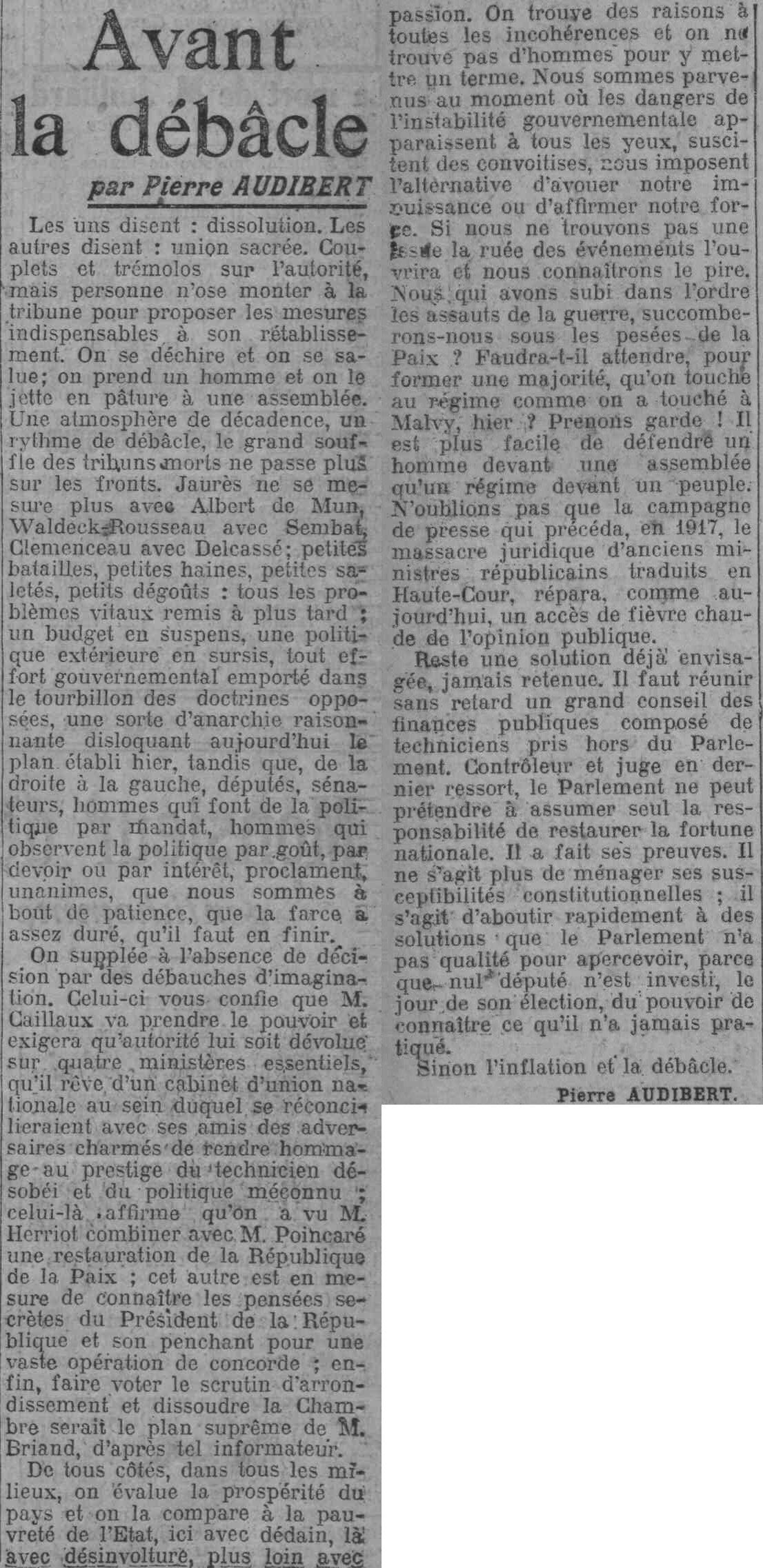De tous côtés, dans tous les milieux, on évalue la prospérité du pays et on la compare à la pauvreté de l'Etat, ici avec dédain, là avec désinvolture, plus loin avec passion. On trouve des raisons à toutes les incohérences et on ne trouve pas d'hommes pour y mettre un ferme. Nous sommes parvenus au moment où les dangers de l'instabilité gouvernementale apparaissent à tous les yeux, suscitent des convoitises, nous imposent l'alternative d'avouer notre impuissance ou d'affirmer notre forme. Si nous ne trouvons pas une issue la ruée des événements l'ouvrira et nous connaitrons le pire. Nous qui avons subi dans l'ordre les assauts de la guerre, succomberons-nous sous les pesées de la Paix ? Faudra-t-il attendre, pour former une majorité, qu'on touche au régime comme on a touché à Malvy, hier? Prenons garde ! Il est plus facile de défendre un homme devant une assemblée qu'un régime devant un peuple. N'oublions pas que la campagne de presse qui précéda, en 1917, le massacre juridique d'anciens ministres républicains traduits en Haute-Cour, répara, comme auourd'hui, un accès de fièvre chaude de l'opinion publique.