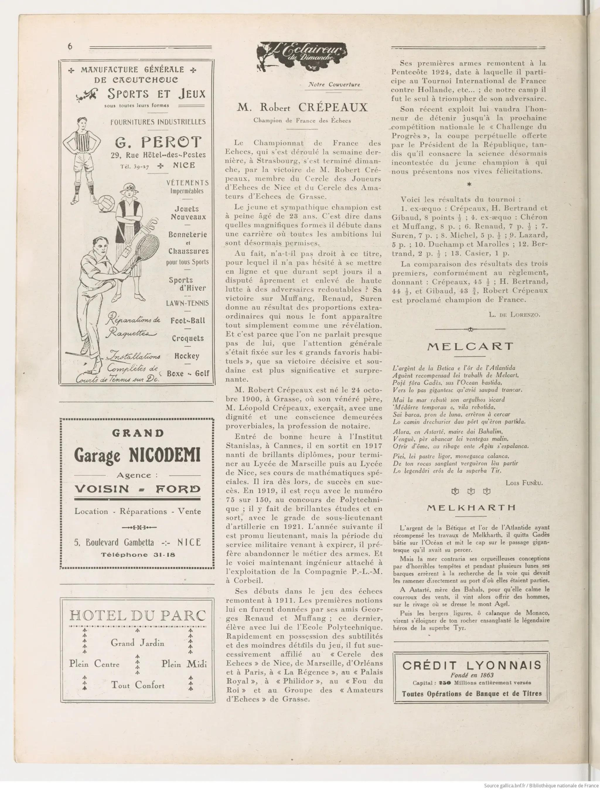 Mr. Robert CRÉPEAUX French Chess Champion The French Chess Championship, which took place last week in Strasbourg, ended on Sunday with the victory of Mr. Robert Crépeaux, member of the Cercle des Joueurs d'Echecs de Nice and the Cercle des Amateurs d'Echecs de Grasse. The young and likeable champion is barely 23 years old. That is to say in what magnificent form he is starting a career where all ambitions are now permitted to him. Mr. Robert Crépeaux was born on October 24, 1900, in Grasse, where his venerated father, Mr. Léopold Crépeaux, practiced, with a dignity and a conscience that remained proverbial, the profession of notary. His beginnings in the game of chess date back to 1911. The first notions were given to him by his friends Georges Renaud and Muffang; the latter, a student with him at the Ecole Polytechnique. Quickly in possession of the subtleties and the smallest details of the game, he was successively affiliated with the "Cercle des Echecs" of Nice, Marseille, Orléans and in Paris, at "La Régence", at the "Palais Royal", at "Philidor", at the Fou du Roi" and at the Group of "Amateur Chessmen" of Grasse. His first weapons date back to Pentecost 1924, the date on which he participated in the International Tournament of France against Hollande, etc.; of our camp he was the only one to triumph over his adversary. His recent exploit will earn him the honor of holding until the next national competition the "Challenge of Progress", the perpetual cup offered by the President of the Republic, while it consecrates the now uncontested science of the young champion to whom we present our warm congratulations. Here are the results of the tournament: L. DE LORENZO. |