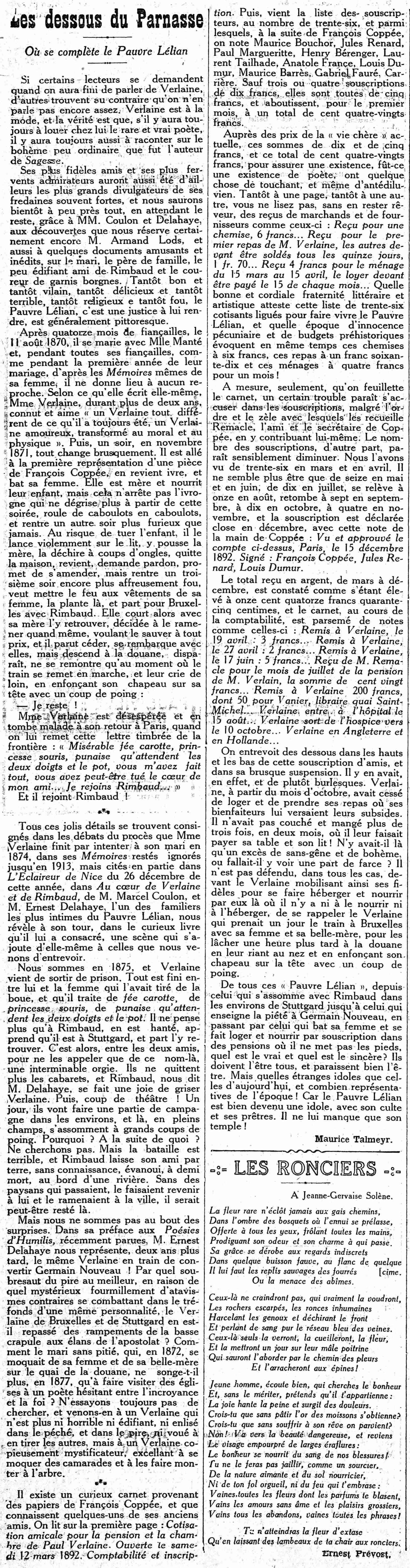 Ses plus fidèles amis et ses plus fervents admirateurs auront aussi été d'ailleurs les plus grands divulgateurs de ses fredaines souvent fortes, et nous saurons bientôt à peu près tout, en attendant le reste, grâce à MM. Coulon et Delahaye, aux découvertes que nous réserve certainement encore M. Armand Lods, et aussi à quelques documents amusants et inédits, sur le mari, le père de famille, le peu édifiant ami de Rimbaud et le coureur de garnis borgnes. Tantôt bon et tantôt vilain, tantôt délicieux et tantôt terrible, tantôt religieux e tantôt fou, le Pauvre Lélian, c'est une justice à lui rendre, est généralement pittoresque.