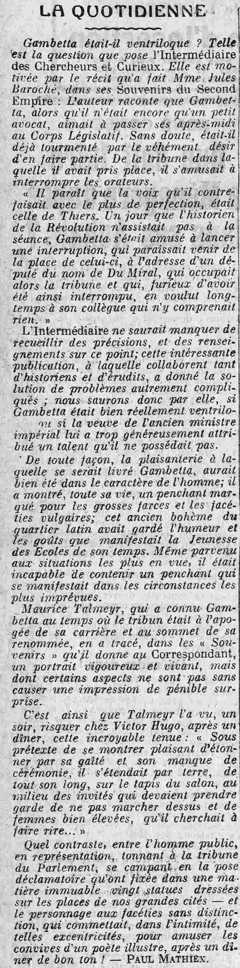 L'Intermédiaire ne saurait manquer de recueillir des précisions, et des renseignements sur ce point; cette intéressante publication, à laquelle collaborent tant d'historiens et d'érudits, a donné la solution de problèmes autrement compliqués, nous saurons donc par elle, si Gambetta était bien réellement ventriloque ou si la veuve de l'ancien ministre impérial lui a trop généreusement attribué un talent qu'il ne possédait pas.