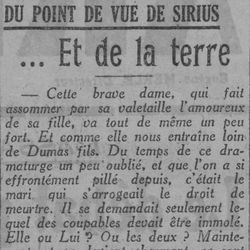- Cette brave dame, qui fait assommer par sa valetaille l'amoureux de sa fille, va tout de même un peu fort. Et comme elle nous entraîne loin de Dumas fils. Du temps de ce dramaturge un peu oublié, et que l'on a si effrontément pillé depuis, c'était le mari. qui s'arrogeait le droit de meurtre. Il se demandait seulement lequel des coupables devait être immolé. Elle ou Lui? Ou les deux ? Maintenant, et ça devient charmant, ce sont les parents de la fille qui se chargent de la petite opération...