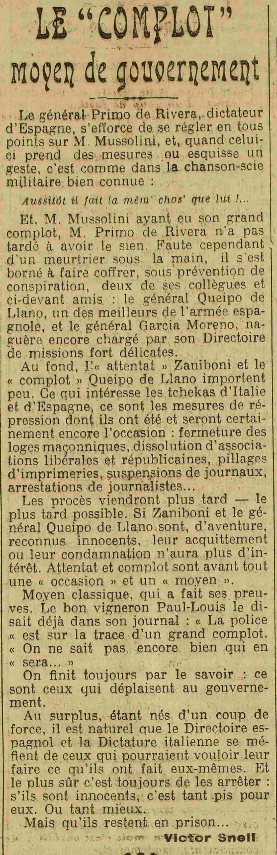 Au fond, l'«attentat» Zaniboni et le complot» Queipo de Llano importent peu. Ce qui intéresse les tchekas d'Italie et d'Espagne, ce sont les mesures de répression dont ils ont été et seront certainement encore l'occasion: fermeture des loges maçonniques, dissolution d'associations libérales et républicaines, pillages d'imprimeries, suspensions de journaux, arrestations de journalistes...