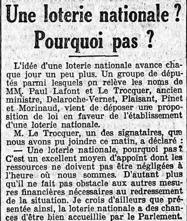 L'idée d'une loterie nationale avance chaque jour un peu plus. Un groupe de députés parmi lesquels on relève les noms de MM. Paul Lafont et Le Trocquer, ancien ministre, Delaroche-Vernet, Plaisant, Pinet et Morinaud, vient de déposer une proposition de loi en faveur de l'établissement d'une loterie nationale.