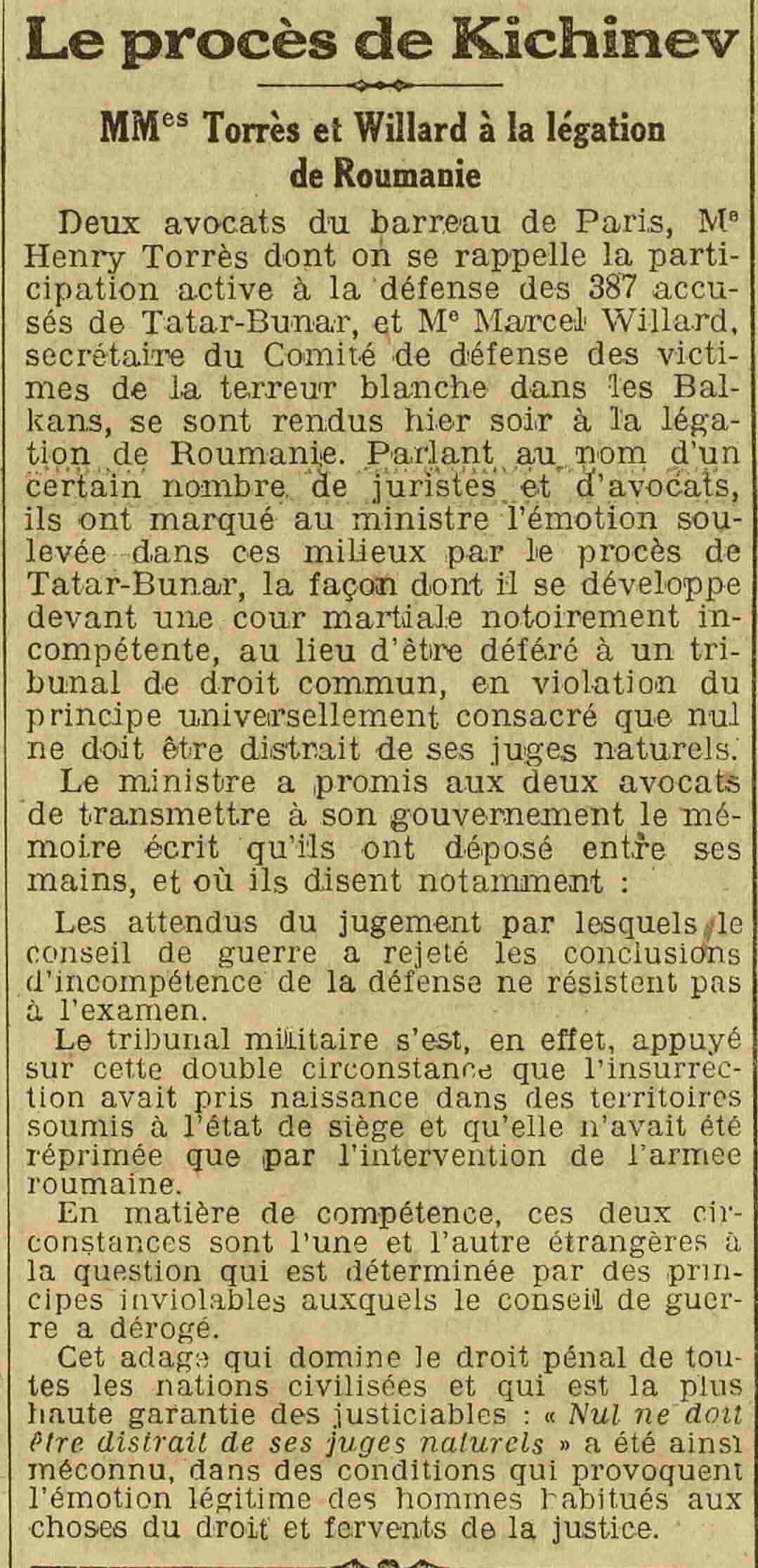 Deux avocats du barreau de Paris, Me Henry Torrès dont on se rappelle la participation active à la défense des 387 accusés de Tatar-Bunar, et Me Marcel Willard, secrétaire du Comité de défense des victimes de la terreur blanche dans les Balkans, se sont rendus hier soir à la légation de Roumanie. Parlant au nom d'un certain nombre de juristes et d'avocats, ils ont marqué au ministre l'émotion soulevée dans ces milieux par le procès de Tatar-Bunar, la façon dont il se développe devant une cour martiale notoirement incompétente, au lieu d'être déféré à un tribunal de droit commun, en violation du principe universellement consacré que nul ne doit être distrait de ses juges naturels. Le ministre a promis aux deux avocats de transmettre à son gouvernement le mémoire écrit qu'ils ont déposé entre ses mains, et où ils disent notamment :