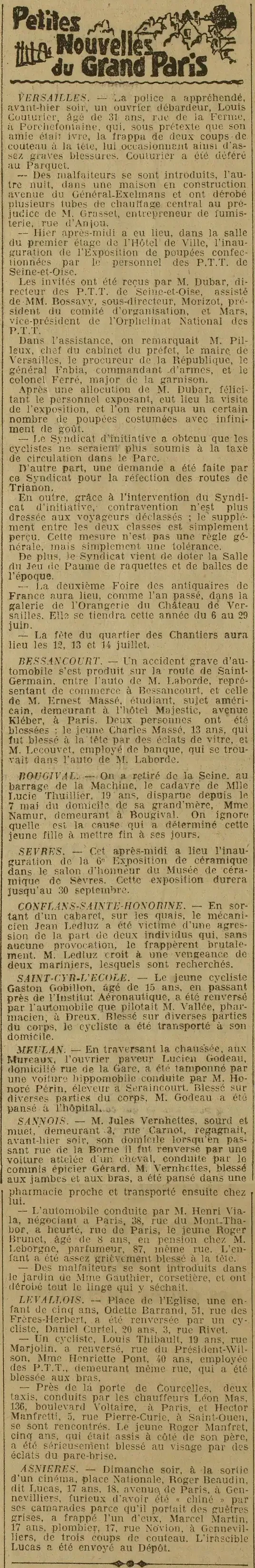 — Près de la porte de Courcelles, deux taxis, conduits par les chauffeurs Léon Mas, 136, boulevard Voltaire, à Paris, et Hector Manfretti, 5, rue Pierre-Curie, à Saint-Ouen, se sont rencontrés. Le jeune Roger Manfret, cinq ans, qui était assis à côté de son père, a été sérieusement blessé au visage par des éclats du pare-brise.