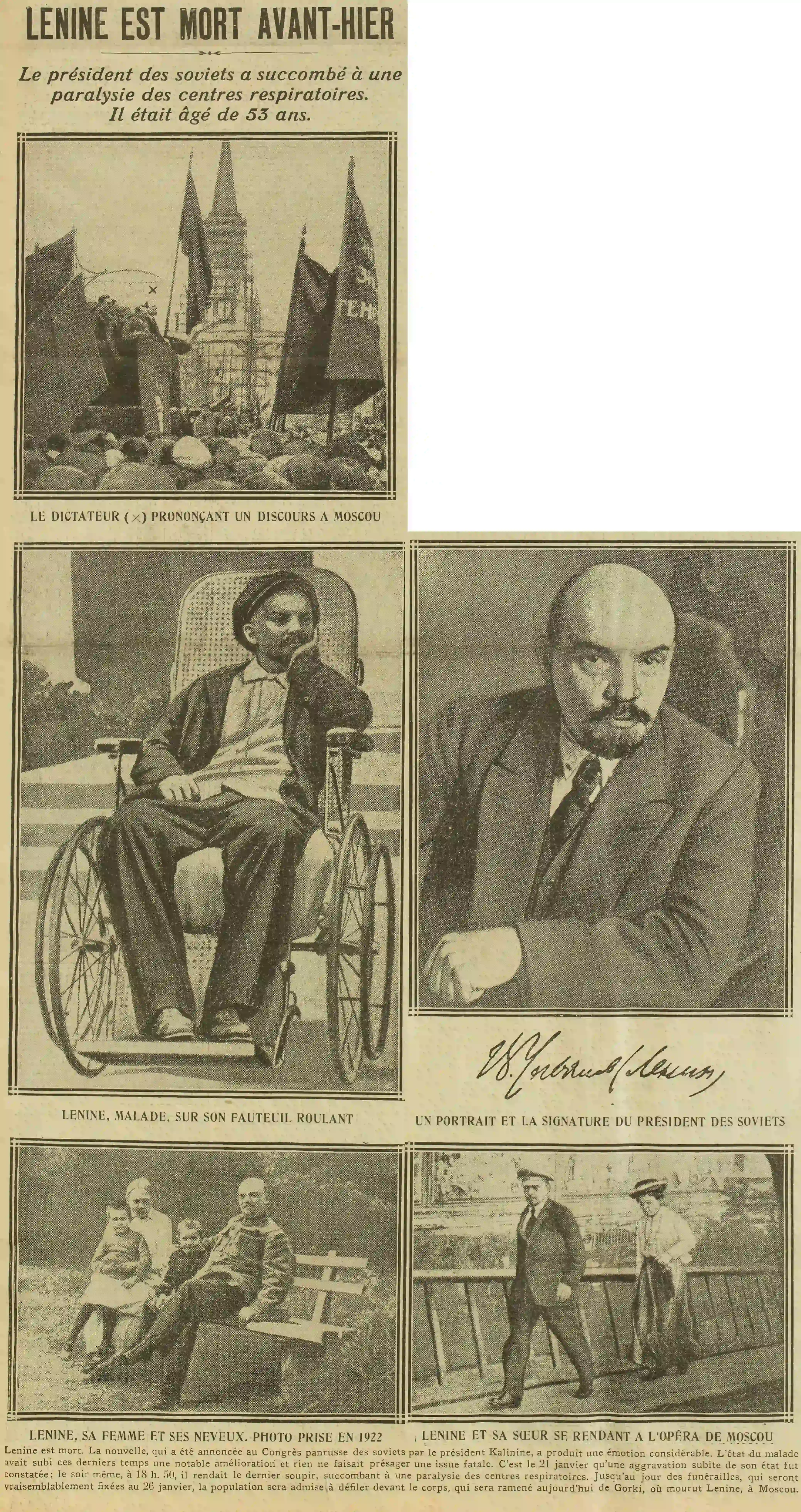 Moscou, 22 janvier. : Le 21 janvier, à 18 h. 50, Vladimir Ilitch Oulianof Lenine est mort à Gorki, près Moscou. Le bulletin médical dit : « Le 21 janvier, une aggravation subite s'est produite dans l'état de santé de Lenine, A 17 h. 30, la respiration est devenue irrégulière. Lenine a perdu connaissance. Les convulsions ont commencé. A 8 h. 50, Lenine mourut à la suite d'une paralysie des centres respiratoires. » L'autopsie du corps a été pratiquée aujourd'hui à 2 heures de l'après-midi. Le bulletin de décès est signé des professeurs Ferster, Abukosov, Bunak, Geftie des docteurs Rosanov, Elistratov, Obukh, Weissbrot et du commissaire à la santé publique, Semachko. Le corps de Lenine sera transporté de Gorki à Moscou demain et sera déposé jusqu'au jour des funérailles, qui auront lieu samedi dans la Maison des soviets, L'accès à sa tombe sera ouvert à toute la population. La première annonce de la mort de celui qui a été l'inspirateur de la révolution russe fut faite ce matin, à 11 heures, devant les délégués au congrès de la Fédération des républiques soviétiques qui célébrait l'anniversaire de la révolution qui éclata à Petrograd en 1905. Un orchestre jouait quand Kameneff, Zinovieff et Kalinine, qui pleuraient tous trois firent leur apparition sur l'estrade. A peine Kalinine avait-il annoncé la funèbre nouvelle que des cris de douleur se firent entendre. Des femmes s'évanouirent et la confusion ne prit fin que quand l'orchestre joua la Marche funèbre de Chopin. Kalinine proposa alors qu'à l'avenir le 21 janvier de chaque année soit considéré comme jour de deuil national.