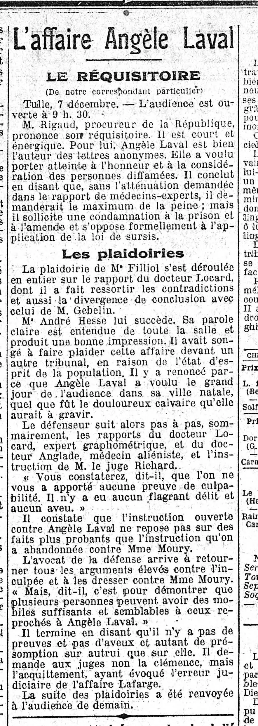 En page trois - l'affaire du corbeau Angèle Laval, le réquisitoire et les plaidoiries |