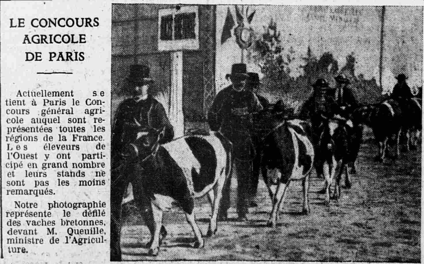 Page une - Monsieur Queuille, ministre de l'agriculture, photographié devant un défilé de vaches bretonnes au Concours agricole de Paris.