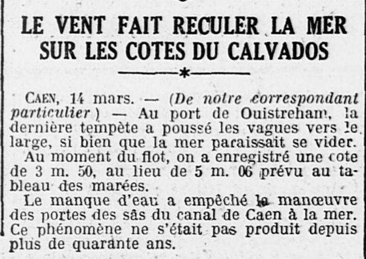 LE VENT FAIT RECULER LA MER SUR LES COTES DU CALVADOS CAEN, 14 mars. (De notre correspondant particulier) - Au port de Ouistreham, la dernière tempête a poussé les vagues vers le large, si bien que la mer paraissait se vider.