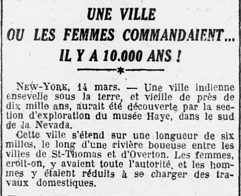 UNE VILLE OU LES FEMMES COMMANDAIENT… IL Y A 10.000 ANS! NEW-YORK, 14 mars. Une ville indienne ensevelie sous la terre, et vieille de près de dix mille ans, aurait été découverte par la section d'exploration du musée Haye, dans le sud de la Nevada.
