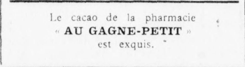 | Page deux - Petits et Grands Faits de la semaine, sans commentaires. Et sur la même page, la pharmacie " Au GAGNE-PETIT" revient ; cette semaine ce n'est pas le café qui est à l'honneur (cf 8 mars 1925), c'est le... Petits et Grands Faits de la semaine Deux jeunes malfaiteurs tentent d'étrangler une mercière de Saint-Ouen. Les dancings de Limoges ferment leurs portes. Le Directeur de Théâtre et écrivain connu, Monsieur Michel Mortier, meurt à 80 ans. Le Lieutenant Colonel Hyvert, commandant les sapeurs-pompiers de Paris, prend sa retraite. La reine des reines sera proclamée le jour de la Mi-Carême. Un important entrepôt de chiffons et papiers situés à La Chapelle est entièrement détruit par un incendie. Les secousses sismiques continuent au Canada. A la station «Volontaires» un ouvrier est décapité par une roue du Nord-Sud. Soixante-seize concurrents ont pris part à la course motocycliste, Paris-Nice. Les États-Unis vont prendre l'initiative d'une conférence monétaire internationale. A Petrograd une partie du toit du Palais d'Hiver s'est effondrée et de précieuses collections ont été endommagées. Les Édiles parisiens remettent au cuirassé Paris l'écusson offert par la ville. La veuve du Président Ebert recevra une rente mensuelle de 750 marks-or. Le courrier postal de Limoux est attaqué par des bandits en auto. Siki est toujours en Amérique et boxera prochainement à Madison Square. Le cabinet Turc est démissionnaire. En Angleterre, un avion tombe sur une école. Le fils de Sarah Bernhardt conserve encore son théâtre jusqu'en 1928. La foule a brûlé vif, à Roegyfort (Georgie) un nègre de vingt-cinq ans pour attentat contre une jeune fille de race blauche. La reine de la T. S. F. s'appellera la «Fée des Ondes». Un député communiste Bulgare est assassiné à Sofia. Aux élections municipales de Londres les conservateurs l'emportent. Le salon des humoristes ouvre ses portes. Les petits télégraphistes font grève. On parle encore d'augmenter le prix du pain.