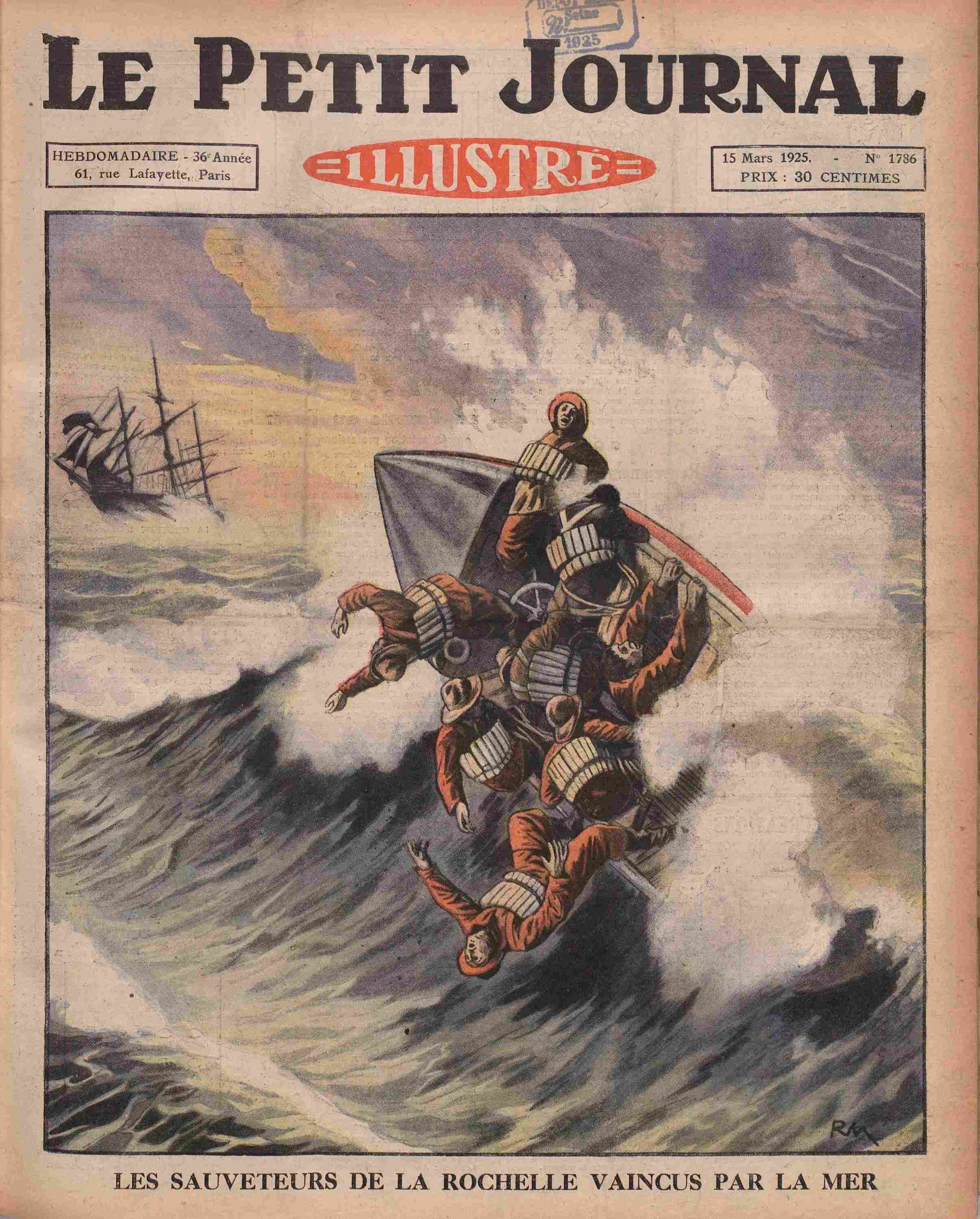 | Page une - Les sauveteurs de la Rochelle vaincus par la mer, une illustration de pleine page et en couleur. |