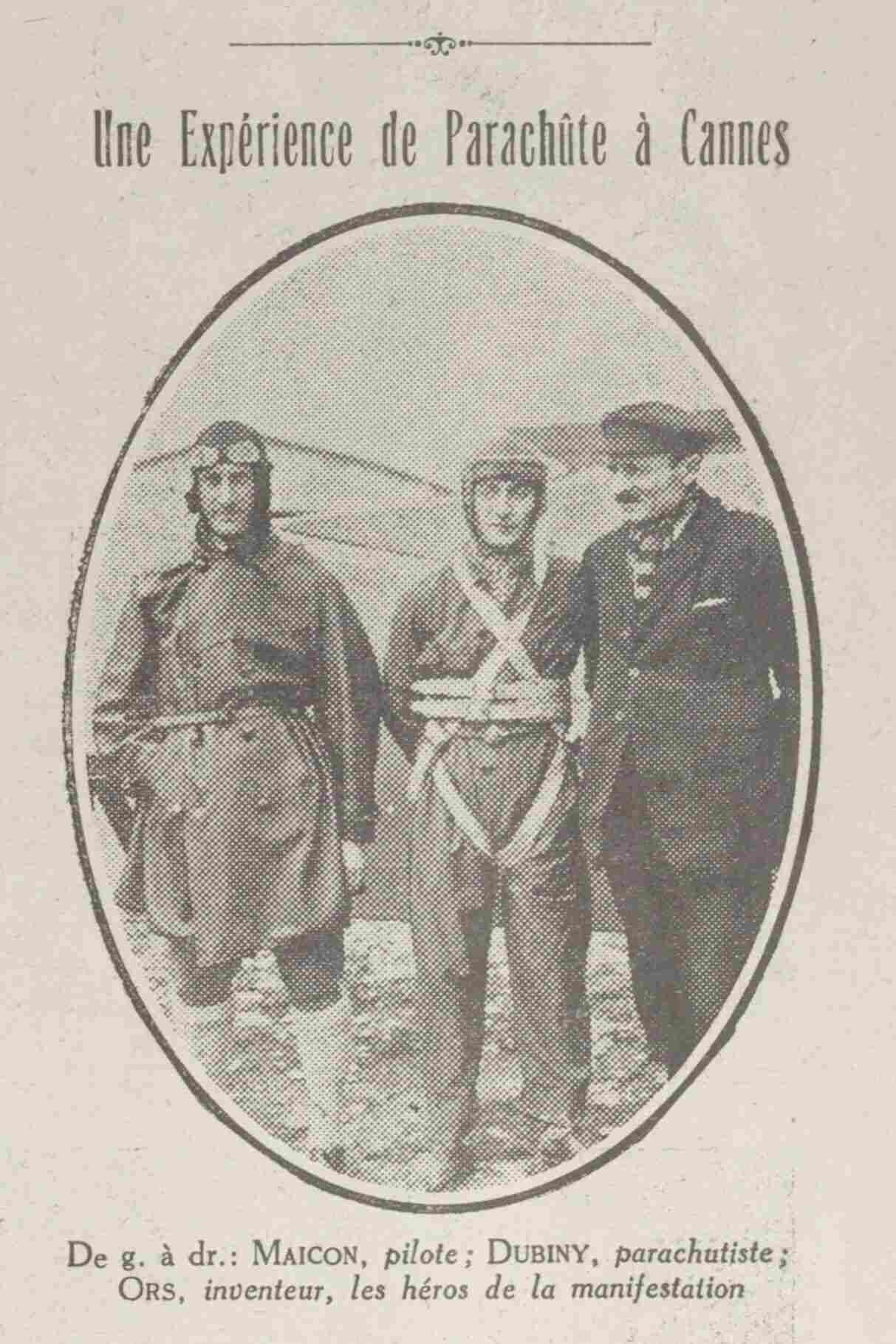 Page quinze - Le pilote Maïcon, le parachutiste Dubigny, et Ors l'inventeur. Une expérience de parachutisme à Cannes. En photo, les héros de la manifestation, |