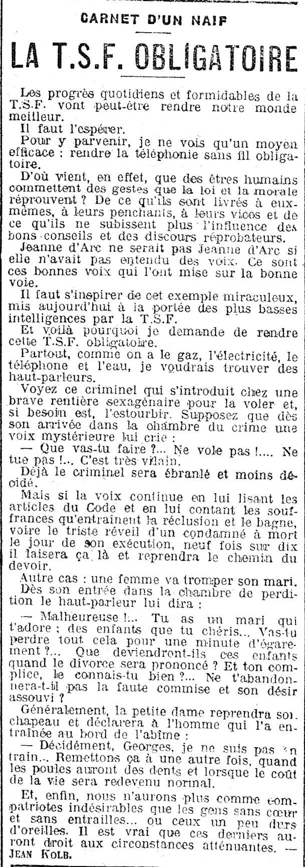 - la T.S.F. oblligatoire , pour, peut-être, rendre le monde meilleur, c'est le rêve d'un naïf |