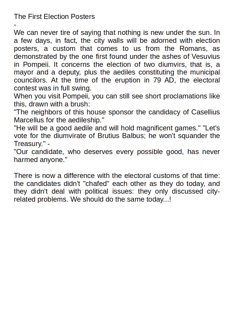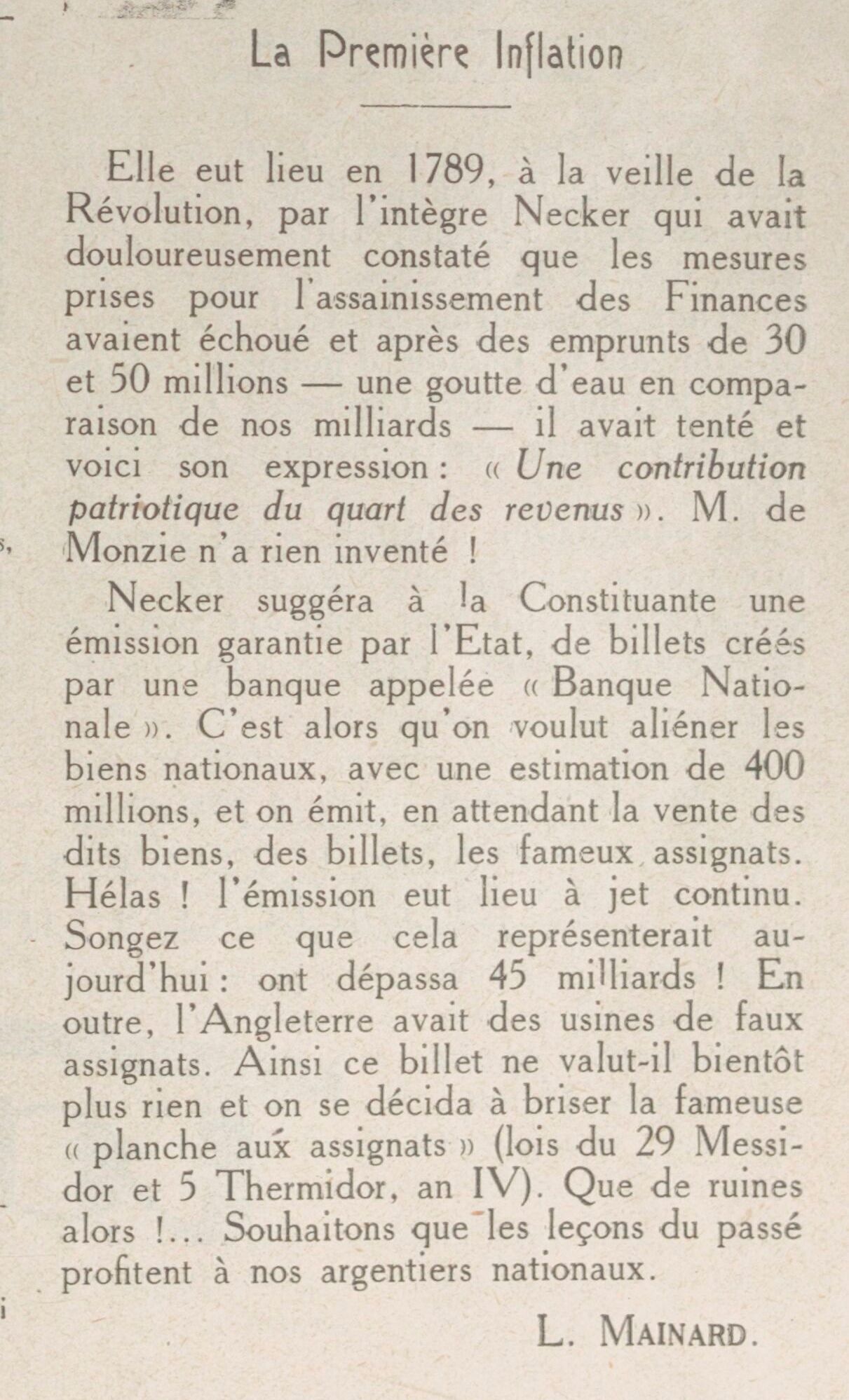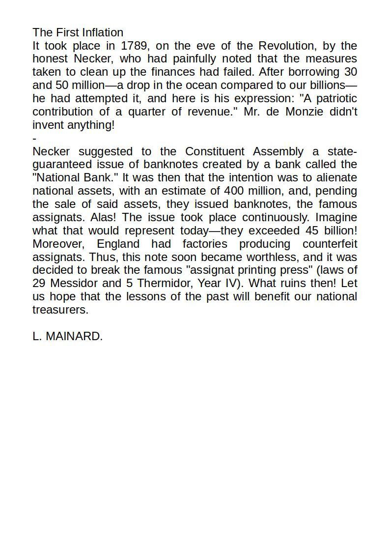 Page fifteen - The first inflation with the honest Necker "a patriotic contribution of a quarter of income" and the alienation of national assets. Let's hope that the lessons of the past will benefit our national treasurers. Same page, the first election posters