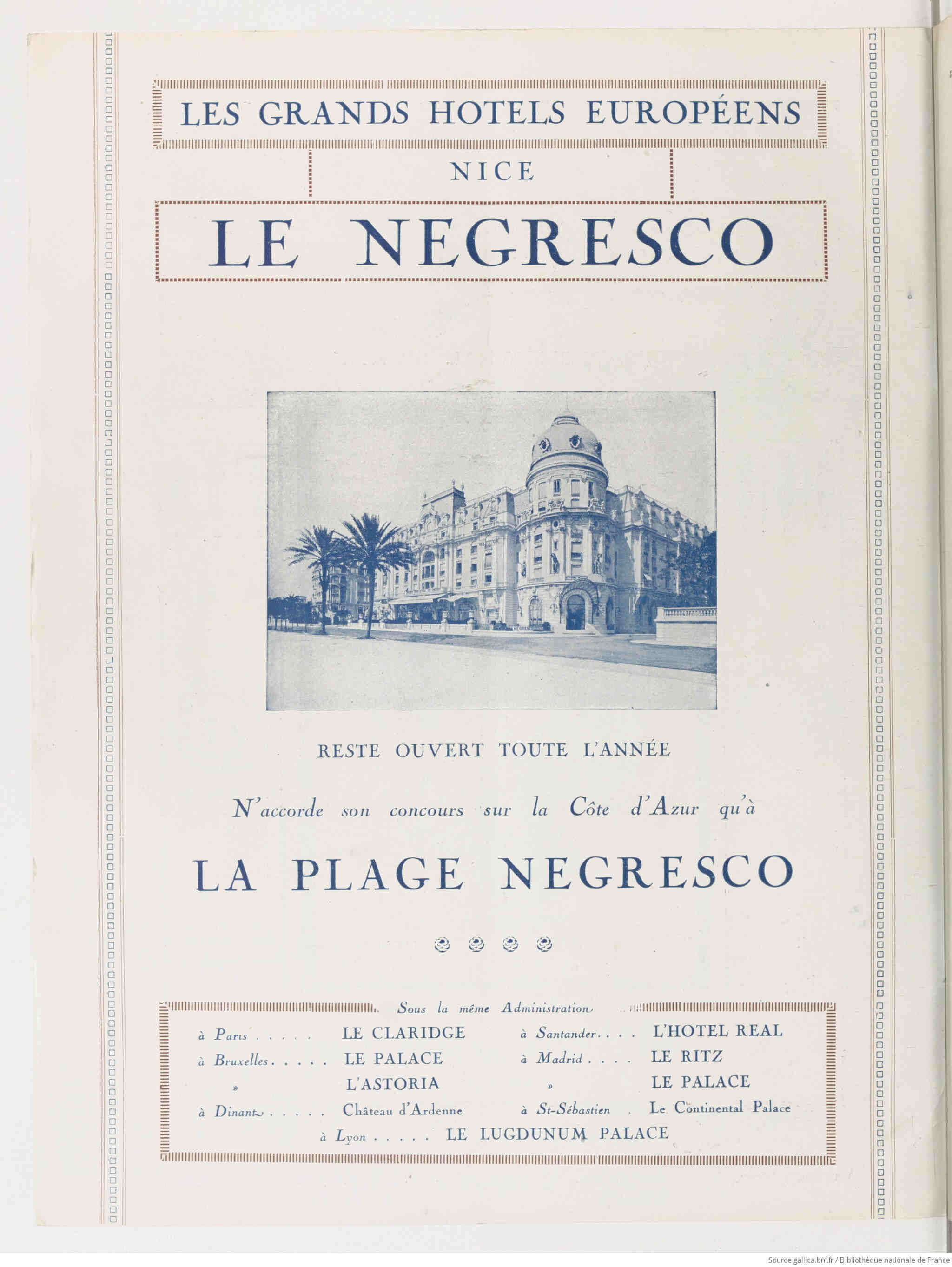 Page Two - La Bignole returns to the Negresco in Nice this week. In the series of great European hotels, the Negresco which remains open all year round and only provides assistance to the Negresco Beach on the Côte d'Azur. |