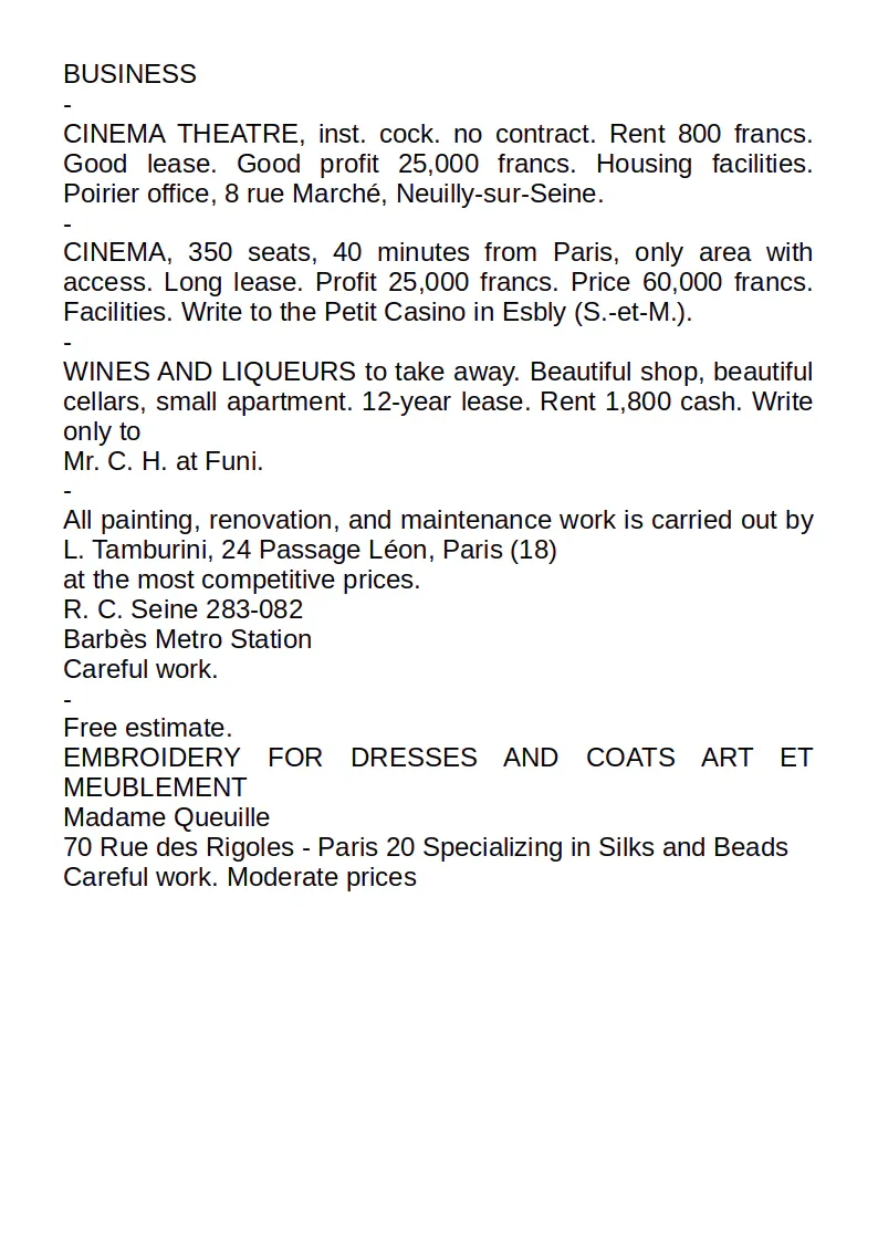 Page four - A small announcement: the sale of a 350-seat cinema in Esbly, Seine-et-Marne, for 60,000 francs, the Petit Casino.
