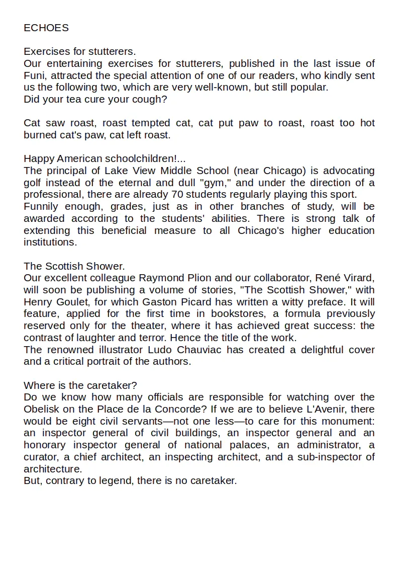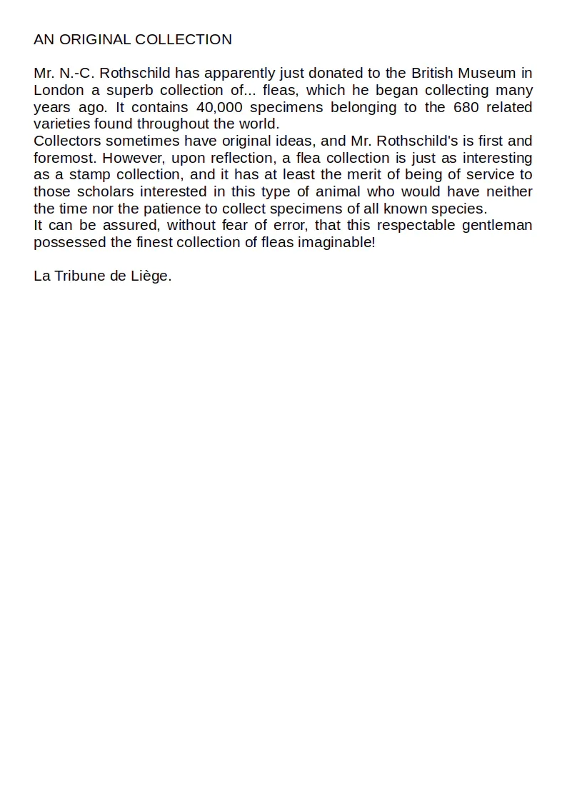 Page three - An original collection of Mr. N.-C. Rothschild, which he entrusted to the British Museum in London. Forests are also being attacked by pine moth larvae, an unprecedented scourge, but Father Wassmann (sic), a Jesuit, is trying to find a solution...Charles Rothschild, an English entomologist, a character to discover, as is his collection of 260,000 Siphonaptera.