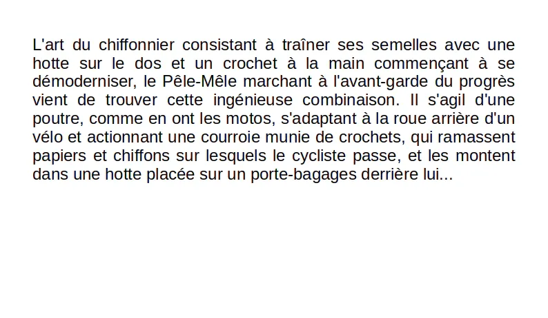 Page Two - The Inventions of the Pele-Mèle, this week the rag-picker bike, which a mayor could invent today to relieve his municipal employees and be virtuous. |