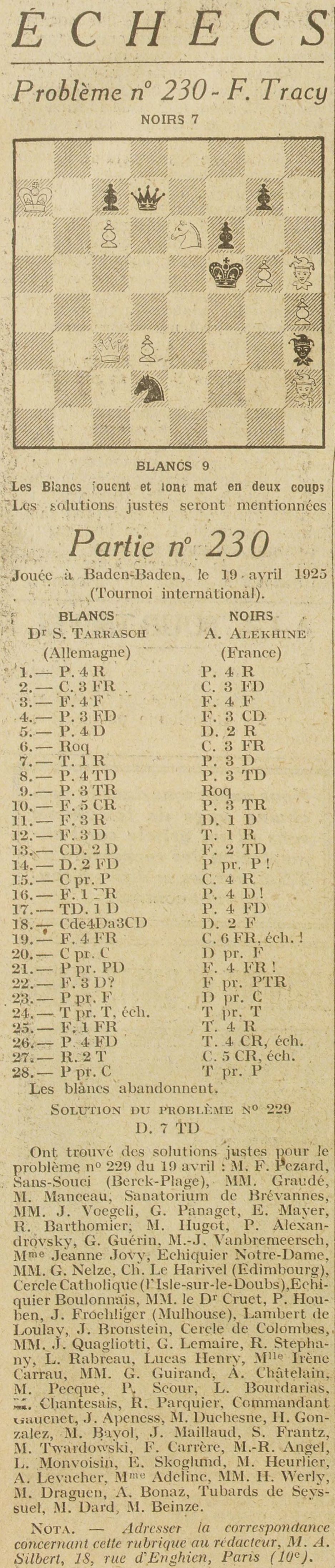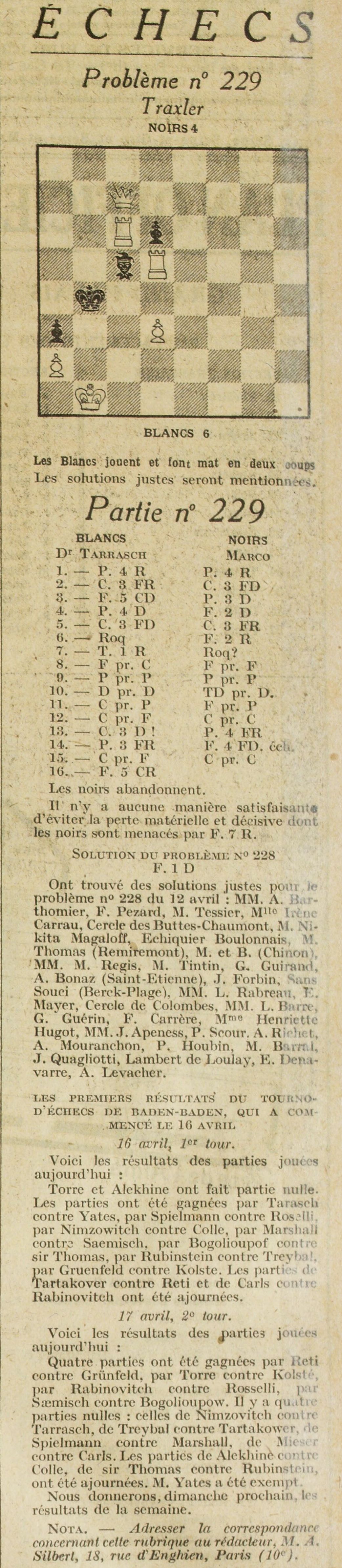 | Aujourd'hui le problème et la partie d'échecs n°229 jouée entre Tarrasch et Marco et le problème et la partie d'échecs n°230 jouée entre Tarrasch et Alekhine le 19 avril 1925 au tournoi international de Baden-Baden. |