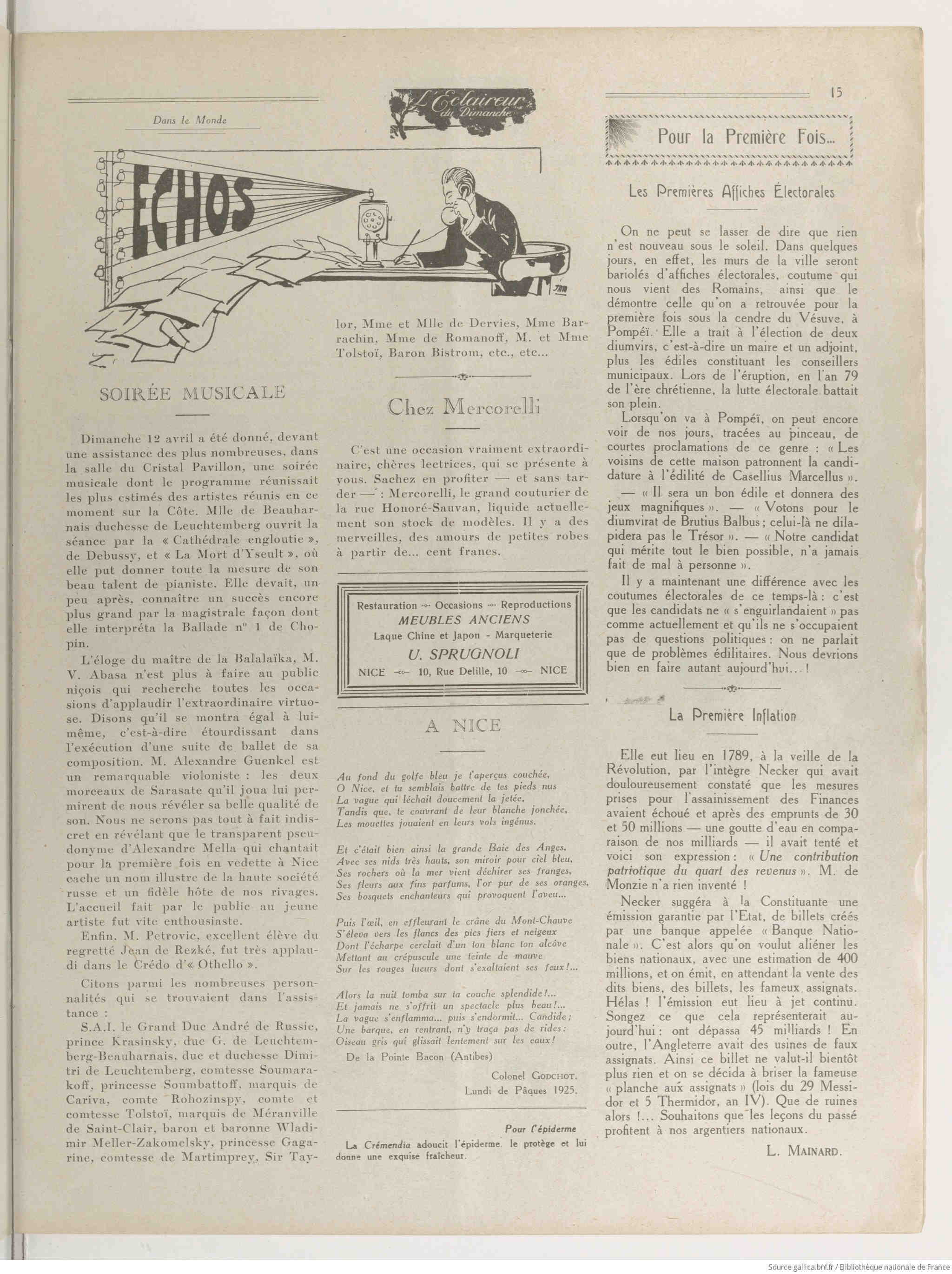 Page quinze - La première inflation avec l’intègre Necker «une contribution patriotique du quart des revenus » et l’aliénation des biens nationaux. Souhaitons que les leçons du passé profitent à nos argentiers nationaux. Même page, les premières affiches électorales
