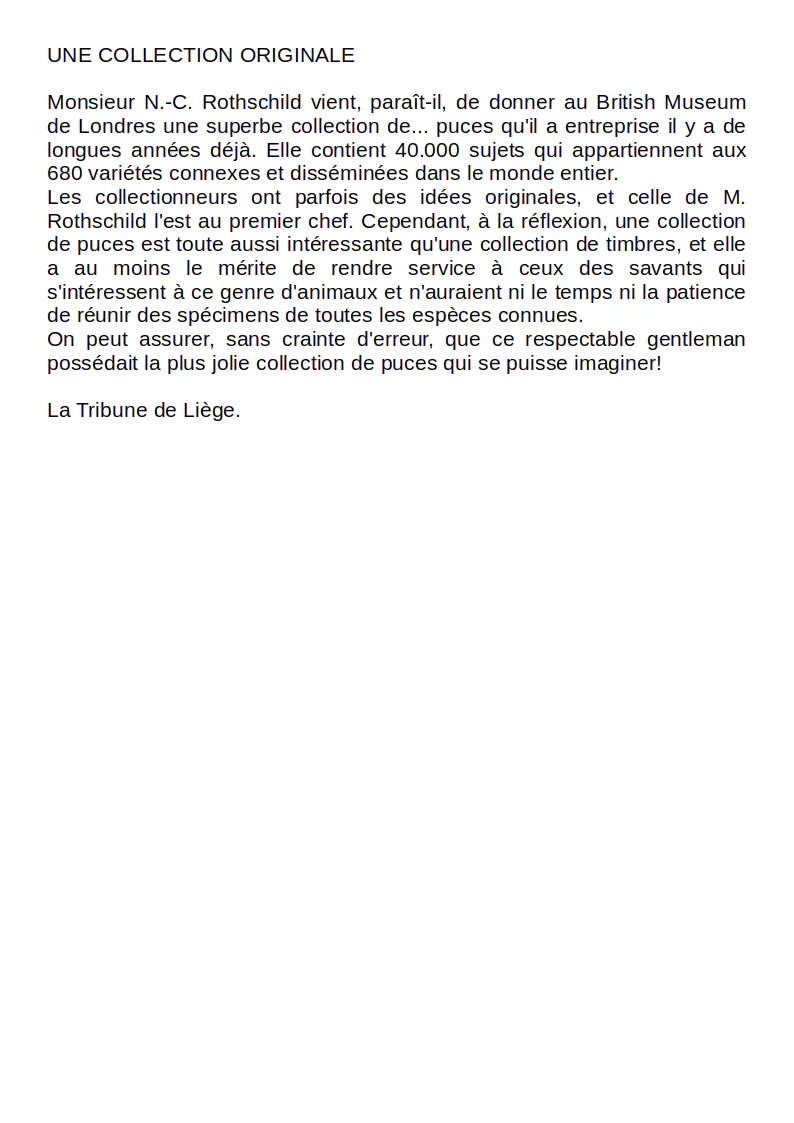 Page trois - Une collection originale de Monsieur N.-C. Rothschild, que ce dernier a confié au British Muséum de Londres. Également des forêts attaquées par des larves du papillon des pins, un fléau sans précédent, mais le père Wassmannn (sic), un jésuite qui tente de trouver une parade...Charles Rothschild, un entomologiste anglais,un personnage à découvrir, comme sa collection de 260 000 Siphonaptères