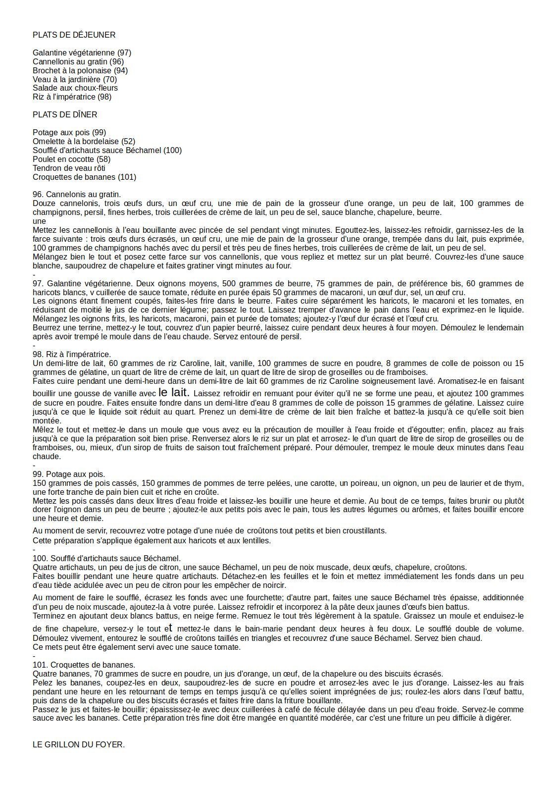 Page six - Le Grillon du foyer et le carnet hebdomadaire de La Bignole. Qu’est-ce qu’on mange ce midi ou ce soir ? Des recettes de saison - 96 cannellonis au gratin - 97 galantine végétarienne - 98 riz à l’impératrice99 potage aux pois avec une nuée de croûtons tout petits - 100 souffle d’artichauts sauce Béchamel - 101 croquettes de bananes. Sur la même page - De tout un peu avec : rissoles à la confiture, milanaise, croquant, meringue et riz aux abricots |