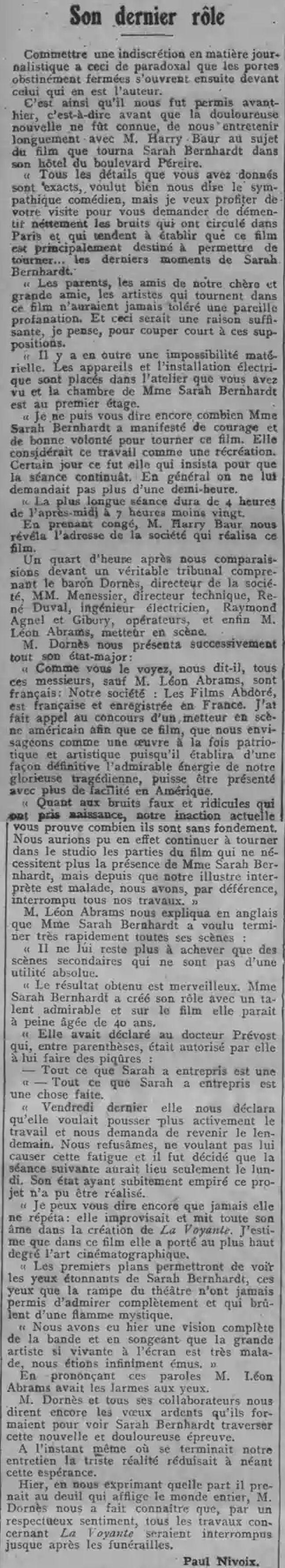 Un entretien avec Harry Baur au sujet du dernier film que tourna Sarah Bernhardt dans son hôtel du bd Pereire