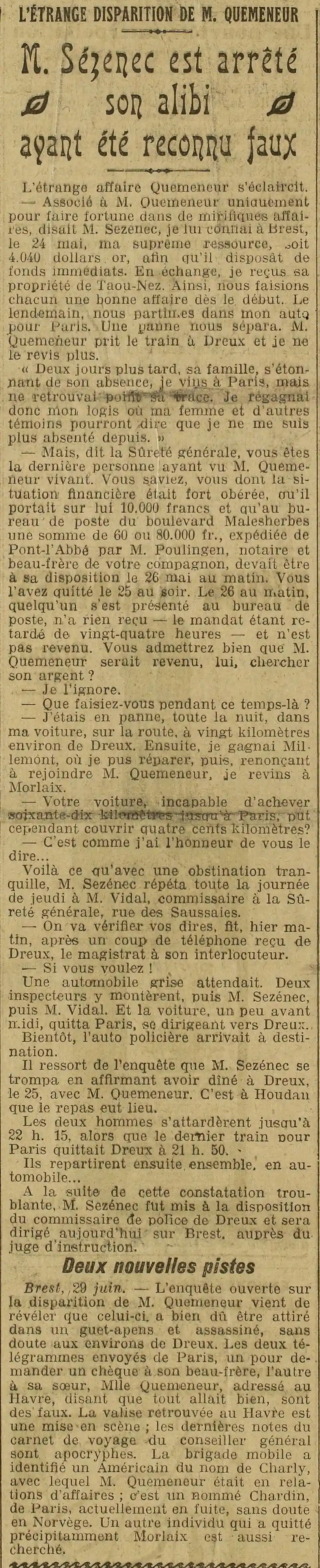 - l'étrange disparition de Pierre Quémeneur : M.Sézenec est arrêté, son alibi ayant été reconnu faux |