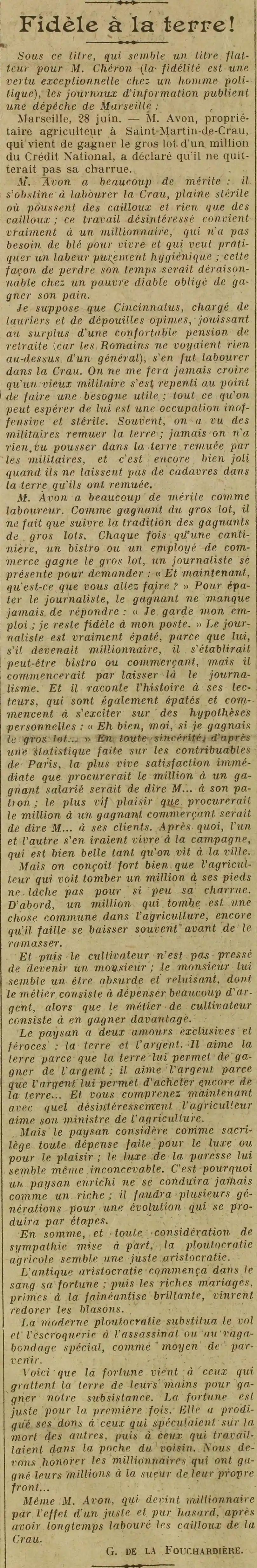 Page deux - fidèle à la terre , M. Avon a beaucoup de mérite, il s'obstine à labourer la Crau, plaine stérile, où il pousse des cailloux, et rien que de cailloux |