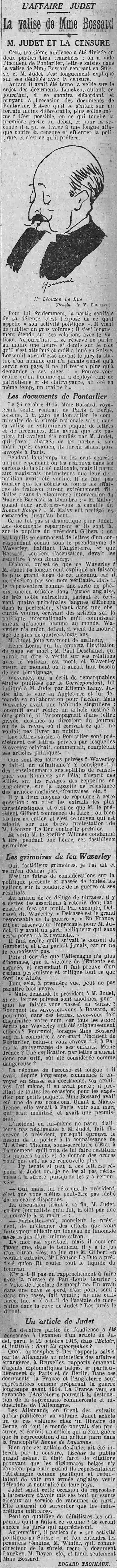 Page une - l'affaire Judet : d'autres détails, la valise de Mme Bossard, Judet et la censure |