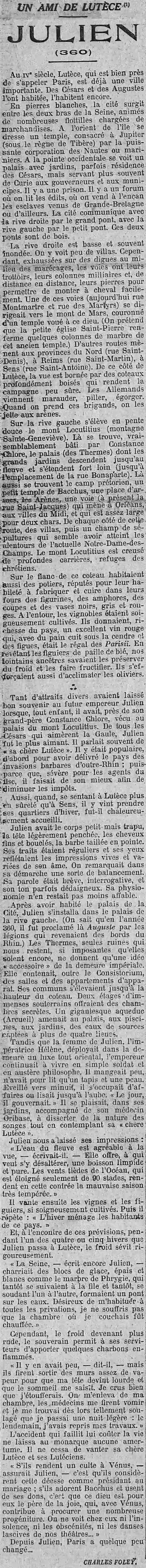 - histoire : Lutèce, qui ne s'appelait pas encore Paris, avait un ami en la personne de l'empereur JulienFlavius Claudius Julianus, Julien II, surnommé Julien l'Apostat par la tradition chrétienne, également appelé Julien le Philosophe, est nommé César en Gaule de 355 à 361 par Constance II, puis proclamé empereur romain à part entière de 361 à 363.extrait wikipedia |