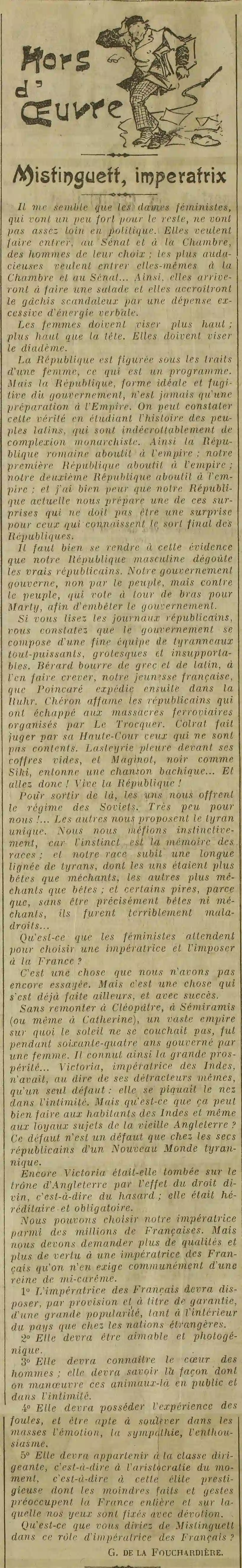 - Mistinguett Impératrix : les dames féministes qui vont un peu fort pour le reste ne vont pas assez loin en politique |